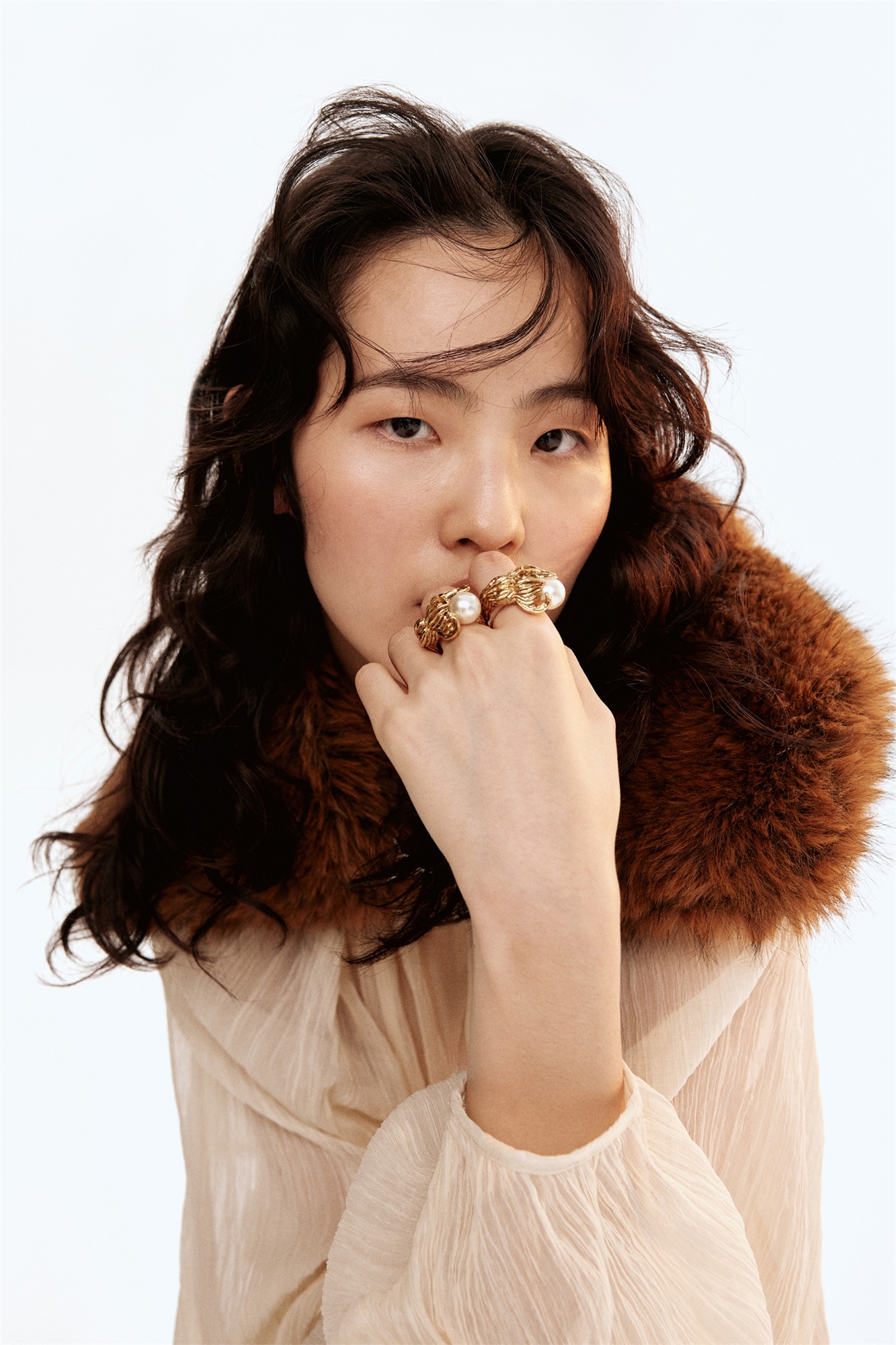 Металлическое кольцо органического дизайна с перламутровой пластиковой бусиной.