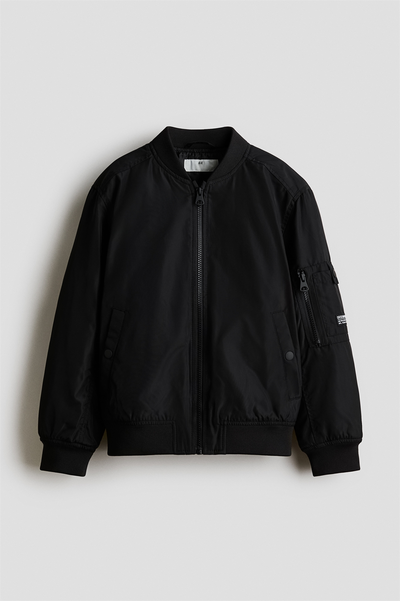 Куртка-бомбер с легкой подкладкой из прочной ткани с легким блеском. Ребристый воротник-стойка, застежка-молния спереди и прорезные боковые карманы с кнопкой. Спущенные плечи и длинные рукава, на одном из которых двойной карман на молнии и открытый карман с застежкой на кнопки. Широкие манжеты и подол отделаны ребристым трикотажем. На подкладке.