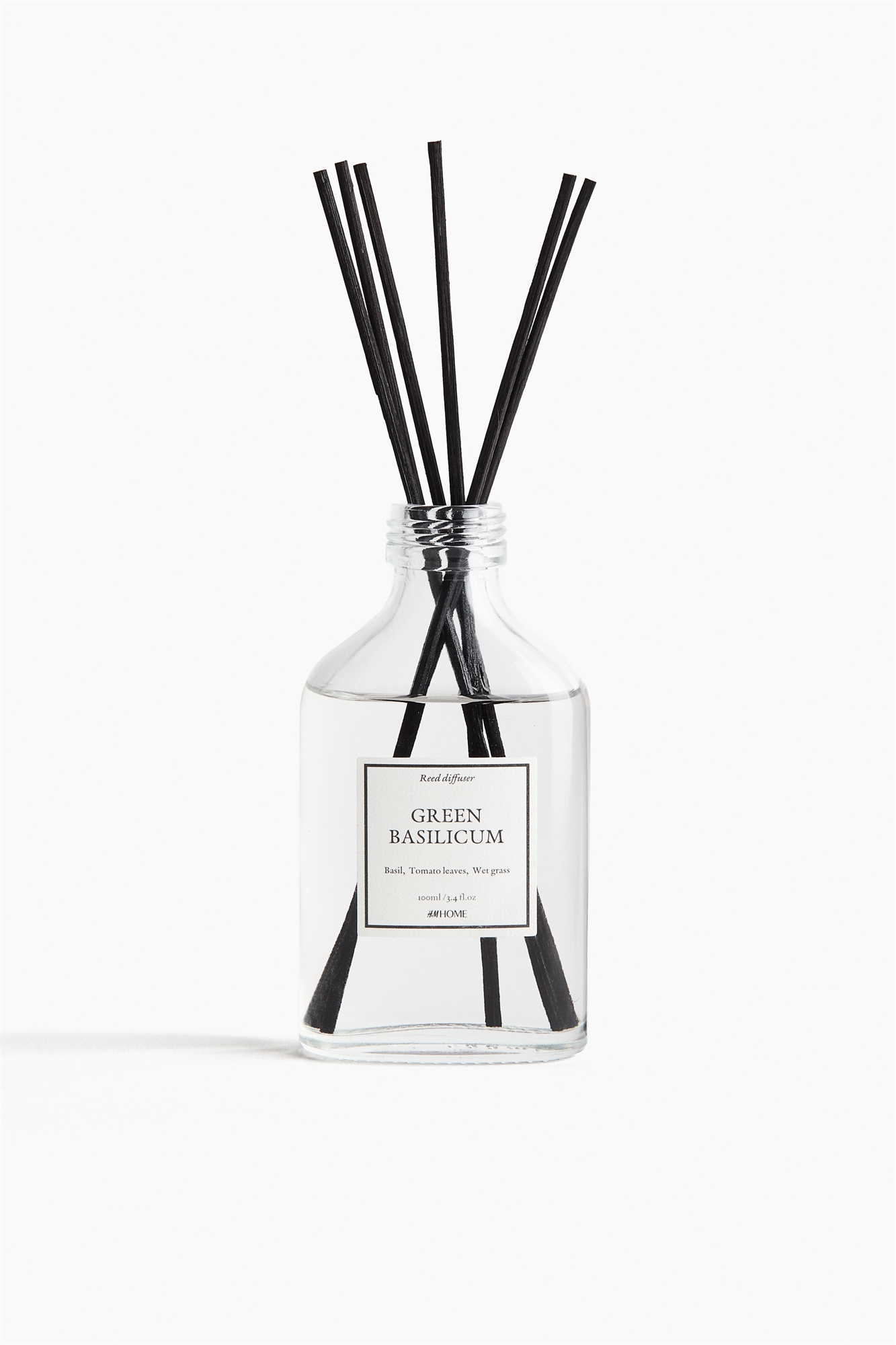 Элегантный стеклянный флакон с ароматическим маслом, снабженный бамбуковыми тростниками, которые впитывают масло и мягко распространяют приятный аромат по всему дому. 100 мл.