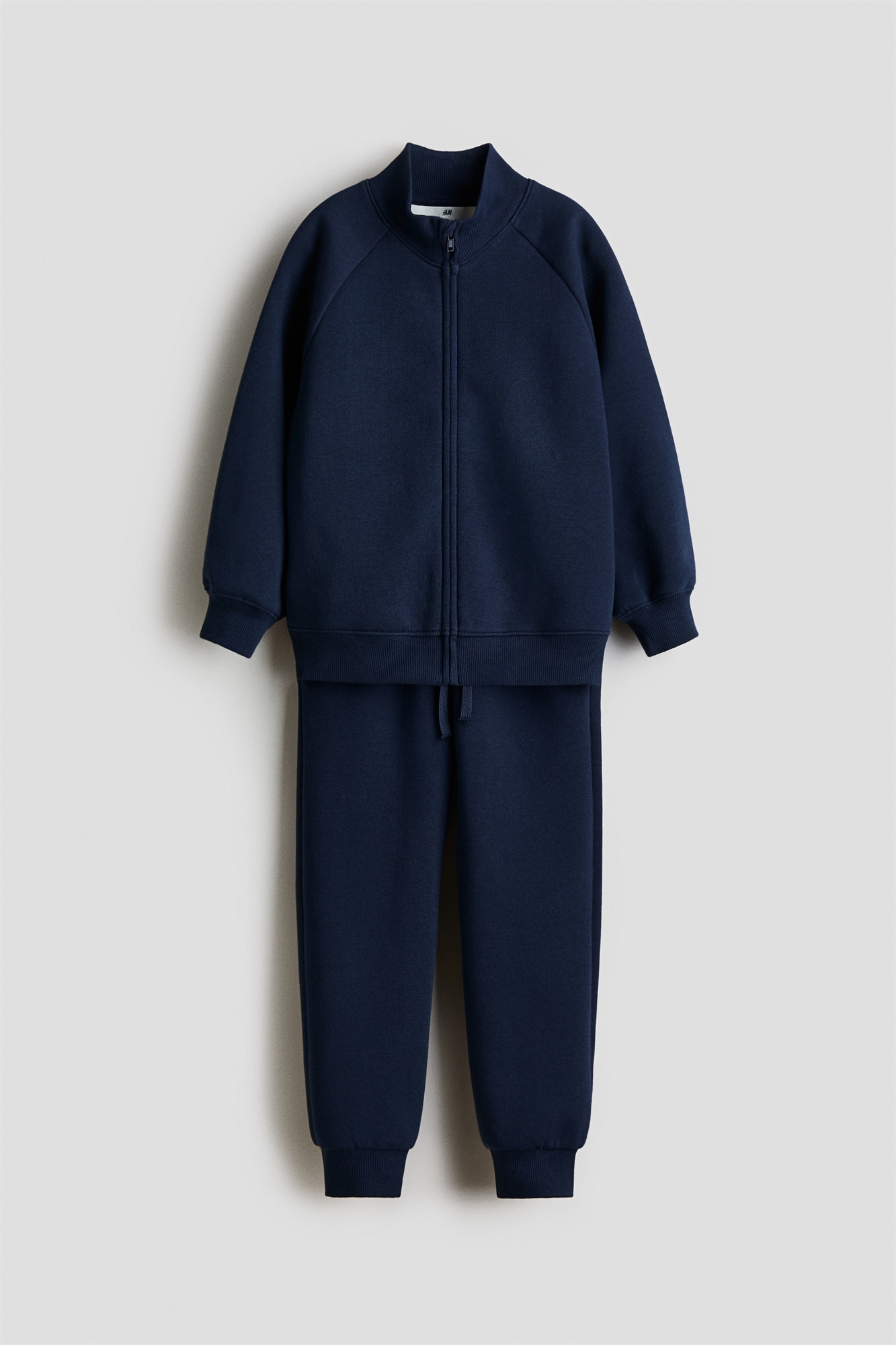 Комплект из куртки на молнии и джоггеров из толстовки с начесом внутри. Куртка с воротником-стойкой, застежкой-молнией спереди, рукавами реглан и окантовкой на манжетах и подоле. Джоггеры с эластичной утягивающейся талией, боковыми карманами и окантовкой по подолу.