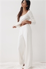 Пижама с верхом и низом из мягкого хлопкового пуантельевого трикотажа. Топ с длинными рукавами, глубоким вырезом, отделанным пико, с аппликацией из атласных роз и сборчатым швом спереди. Нижние штанишки с закрытой резинкой и аппликацией в виде атласной розы на талии и широкими ножками.