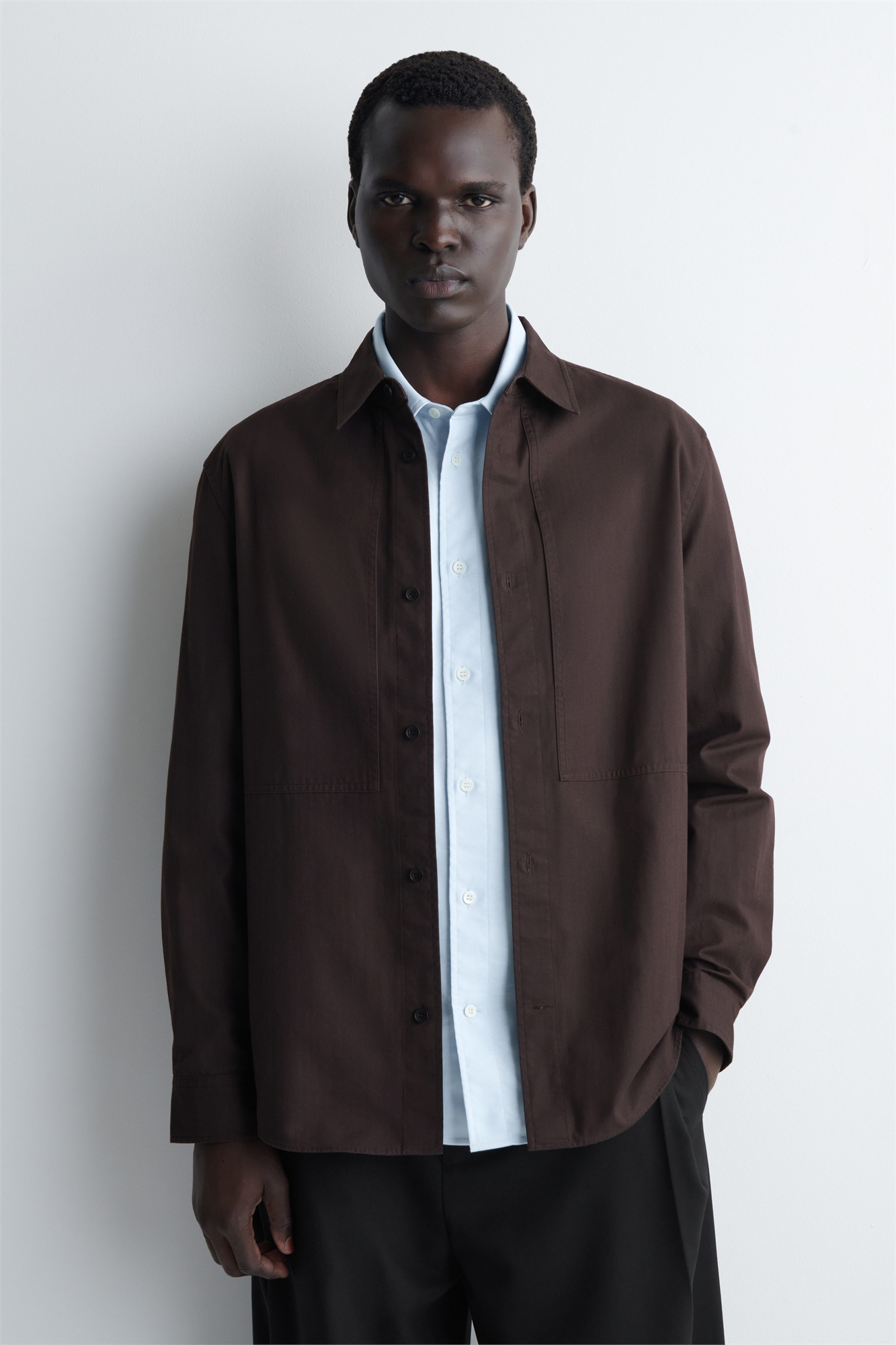 Эта современная рубашка представляет собой элегантный вариант повседневной униформы. Она сшита из хрустящего хлопка и имеет заостренный воротник, детали в виде панелей и пару тонких прорезных карманов на груди. Подойдите к брюкам в тон.