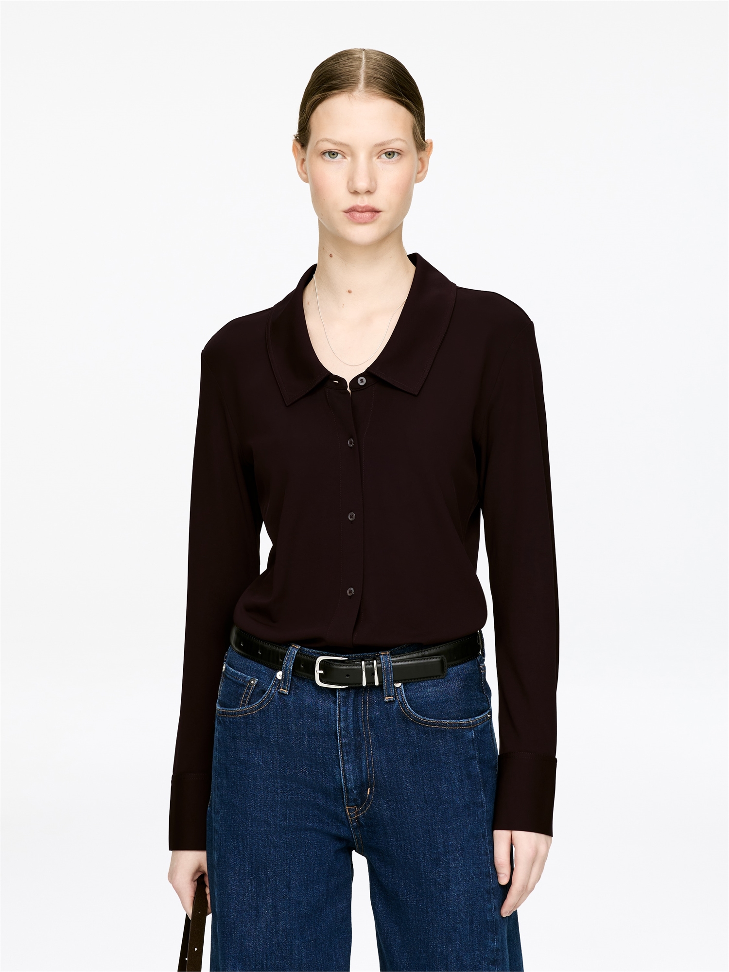 Рубашка из эластичной ткани джерси с отложным воротником, глубоким вырезом спереди и перламутровыми пуговицами. Глубокие манжеты с разрезами и перламутровая застежка на пуговицах. Облегающий крой.