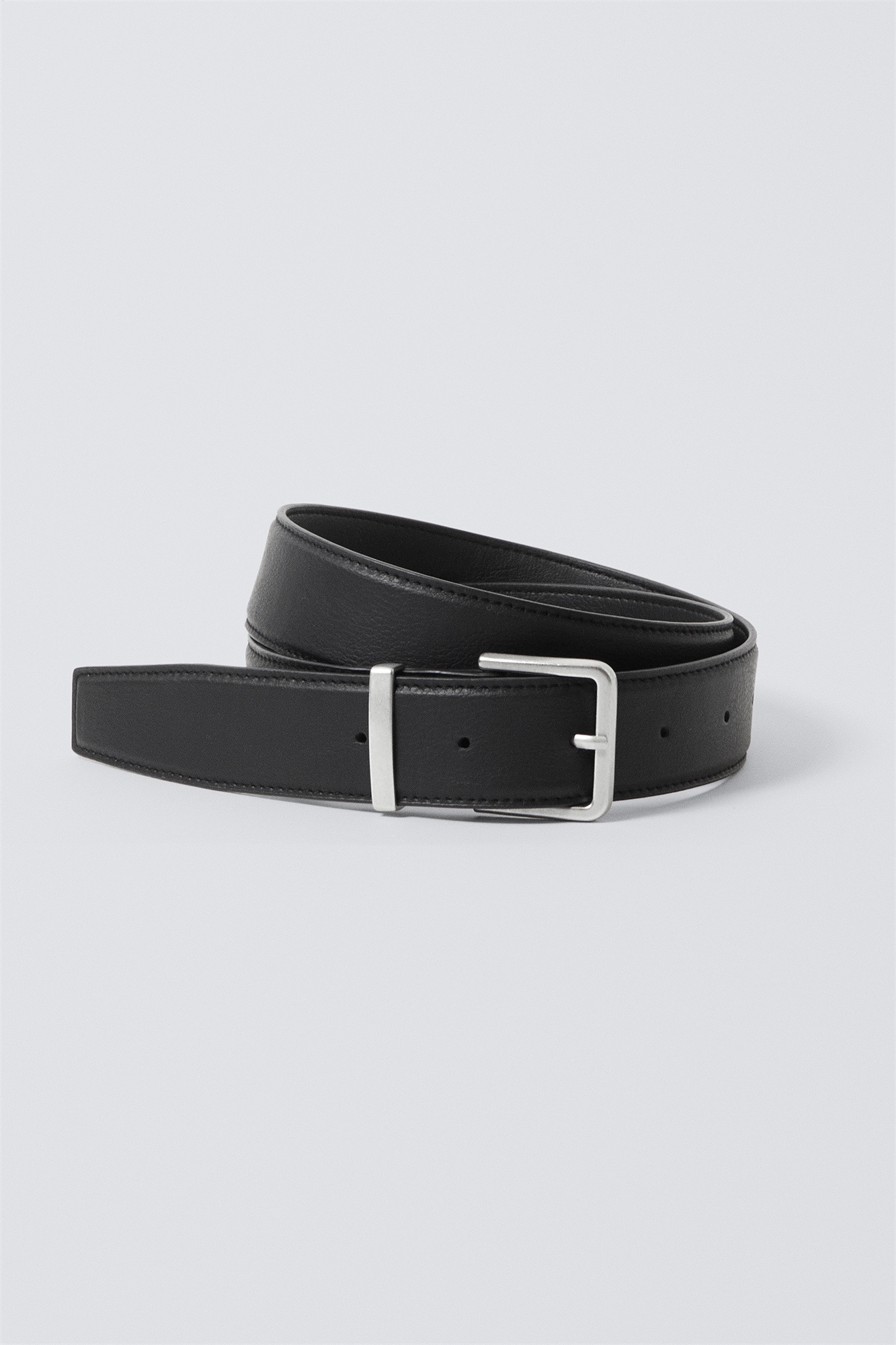 Нестареющий ремень из гладкой искусственной кожи с матовой отделкой. Прямоугольная металлическая пряжка из потертого родия, штампованные отверстия для регулировки и окрашенные края для создания чистого силуэта. Двухслойная конструкция и тонкая строчка.