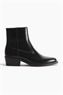 Сапоги с миндалевидными носками, каблуками и высокими голенищами, застегивающимися на молнию с одной стороны. Подкладка и стелька из холста. Резиновая подошва с рисунком.