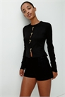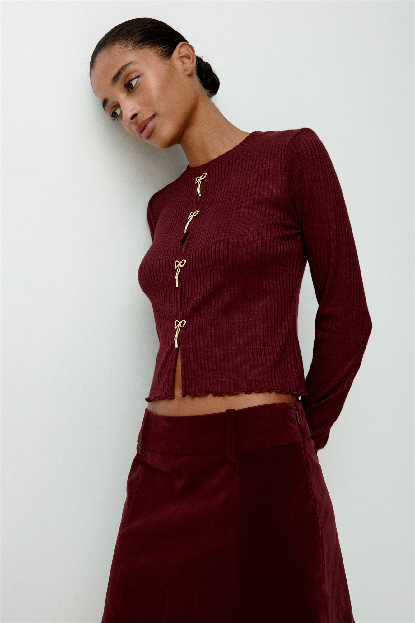 Короткий приталенный топ из ребристого трикотажа с круглым вырезом и небольшими проймами с металлическими деталями в виде бантов спереди, создающими иллюзию кардигана. Манжеты и подол обработаны оверлоком.