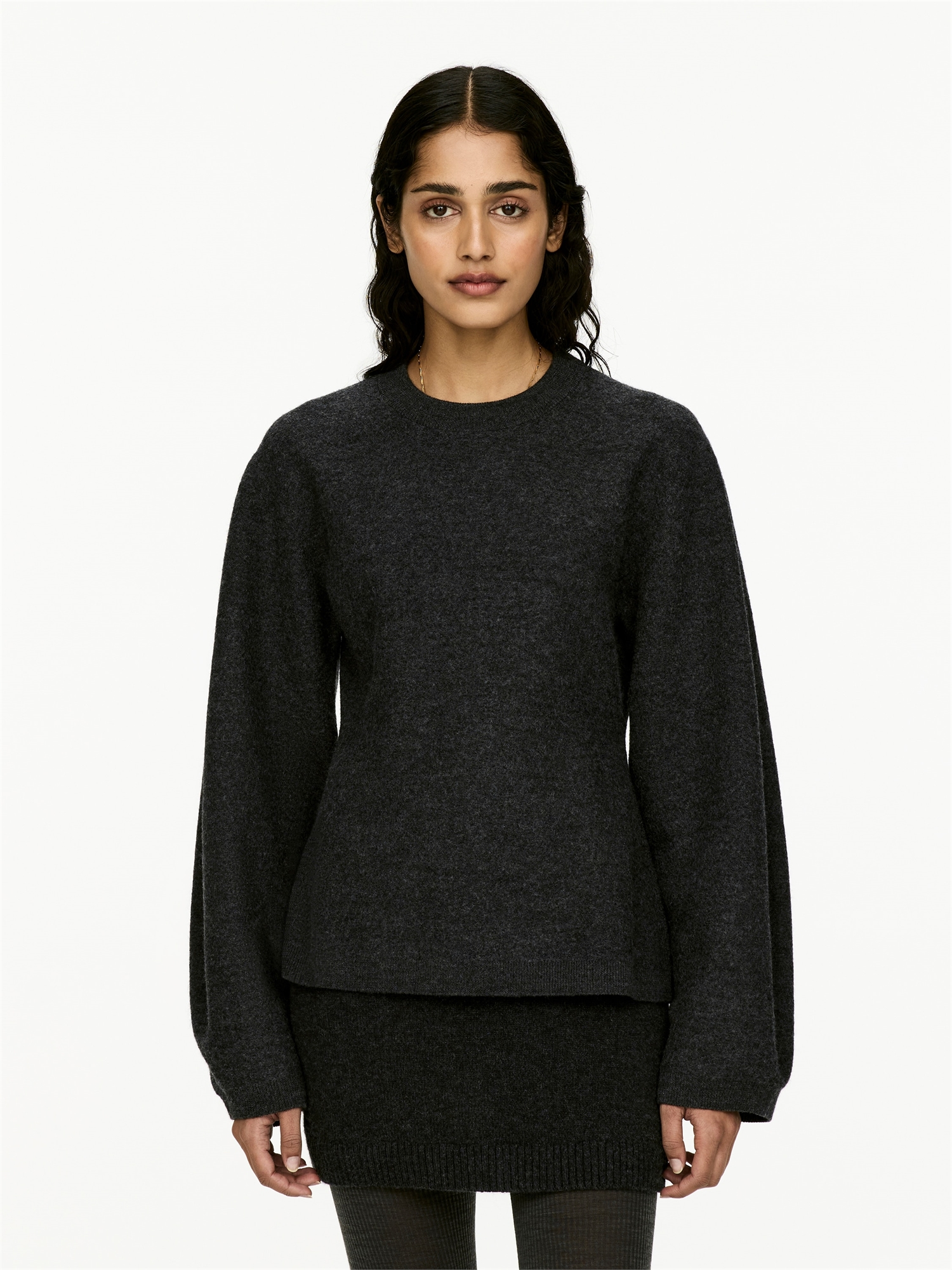 Джемпер из вареной шерсти. Модель с вырезом горловины и широкими рукавами, приталенная на талии. Содержит 100% шерсти RWS (TE-00047206). Продукция, сертифицированная по стандарту ответственной шерсти (RWS), содержит шерстяное волокно с ферм, прошедших независимую сертификацию на соответствие требованиям по благополучию животных и землепользованию.