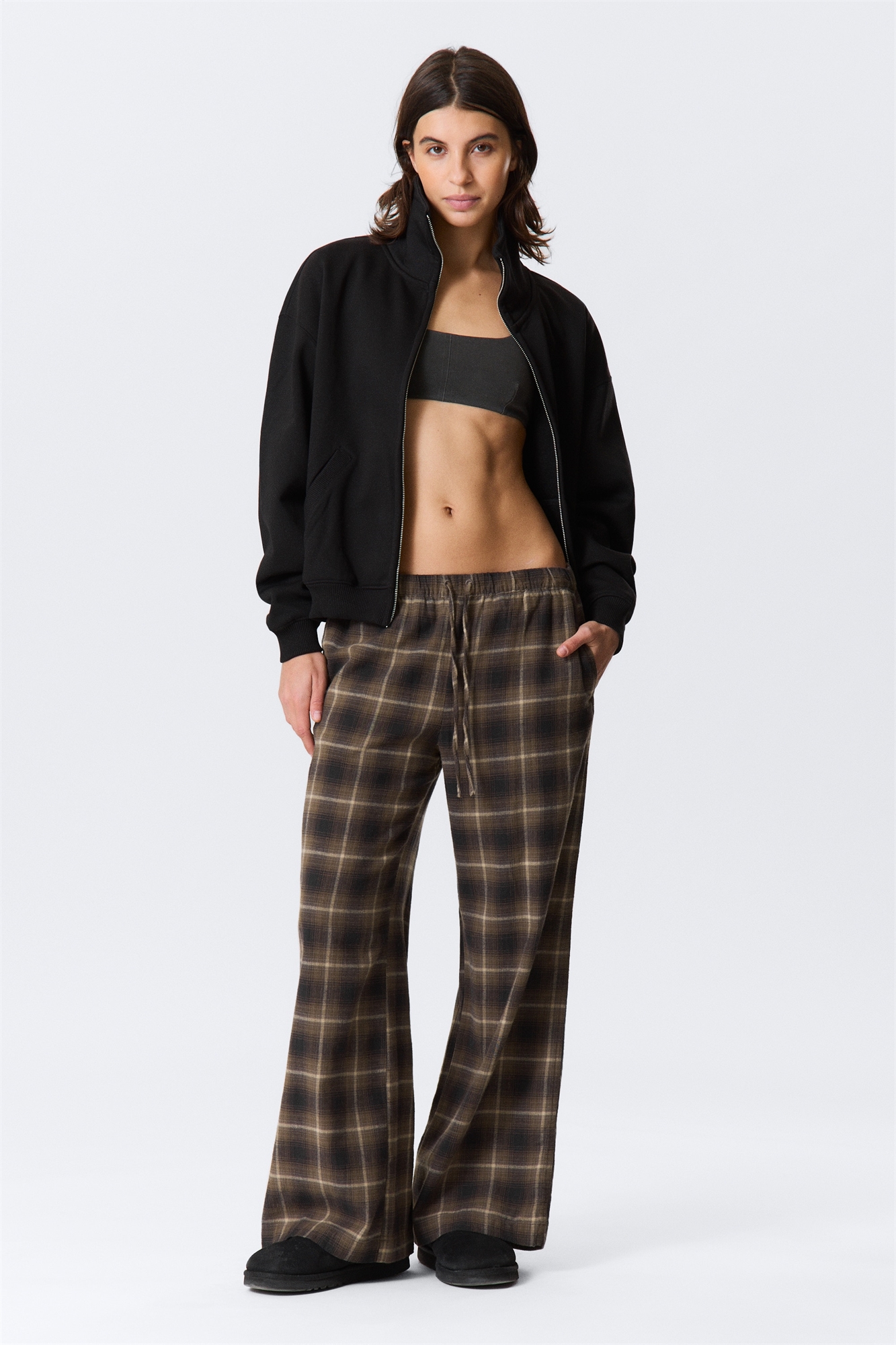 Широкие фланелевые пижамные брюки с широкими штанинами сшиты из мягкого хлопка. Модель имеет эластичный пояс со средней посадкой и косые боковые карманы.