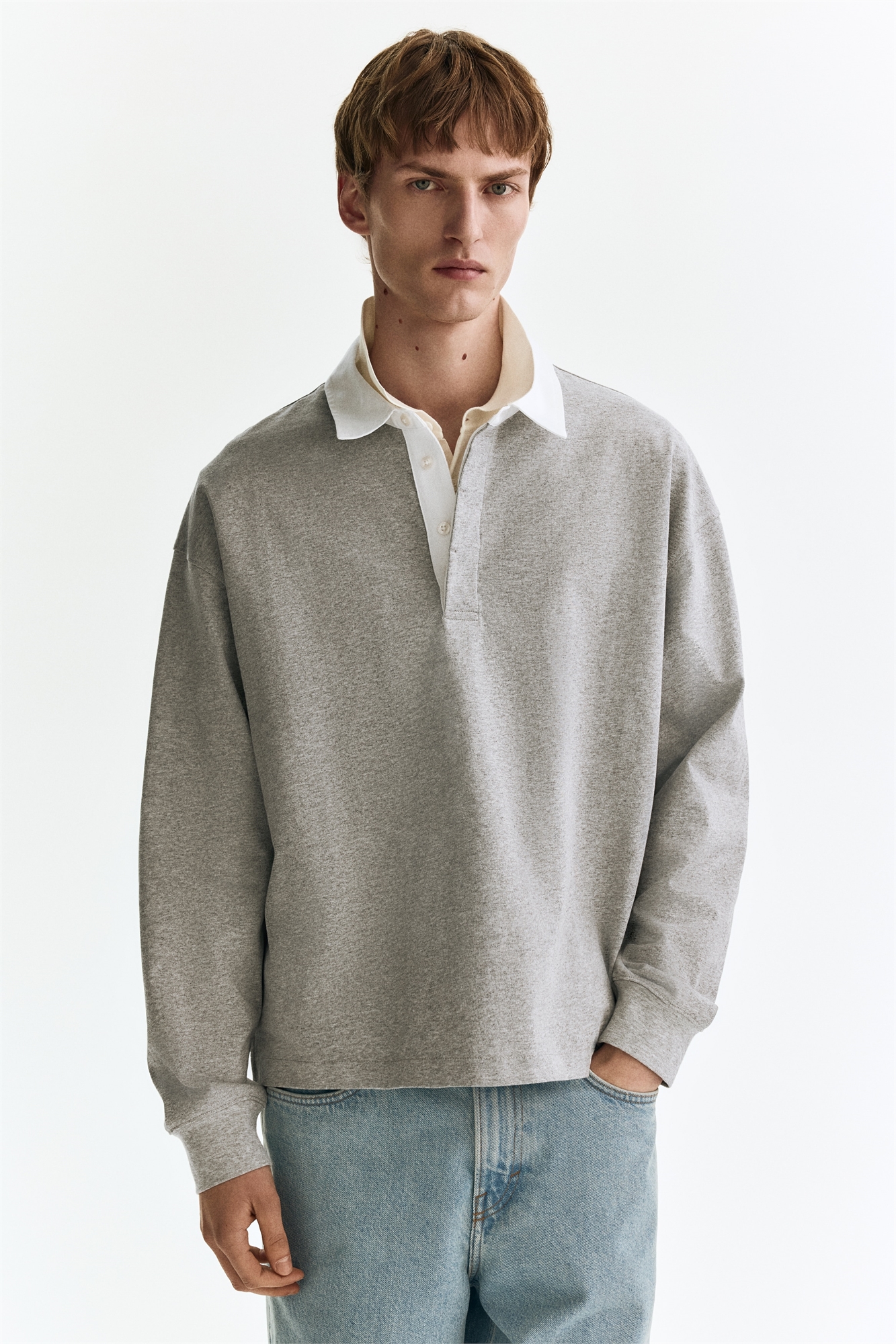 Рубашка-поло из мягкого хлопкового джерси с отложным воротником из саржи и потайной застежкой на пуговицы. Спущенные плечи, длинные рукава с манжетами в рубчик и разрезы по бокам подола. Свободный крой для пышного, но не чрезмерно большого силуэта.