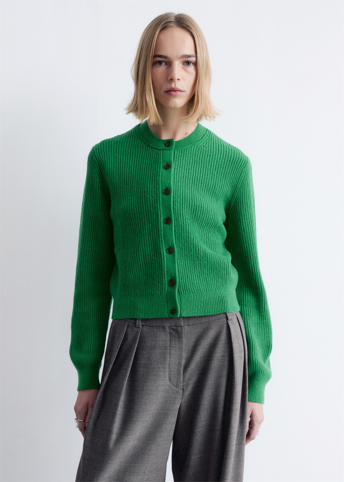 Этот классический кардиган с длинными рукавами и коротким узким силуэтом связан из смеси шерсти и хлопка с ребристыми манжетами. Дизайн с цепным стежком на вырезе создает фактурный вид. Длина кардигана: 52 см (размер S)