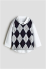 Комплект из рубашки из мягкого хлопкового полотна и жилета из мягкого хлопкового трикотажа. Рубашка с длинными рукавами, отложным воротником, пуговицами спереди, манжетами на пуговицах и закругленным подолом. Свитер-жилет с V-образным вырезом и ребристой отделкой.