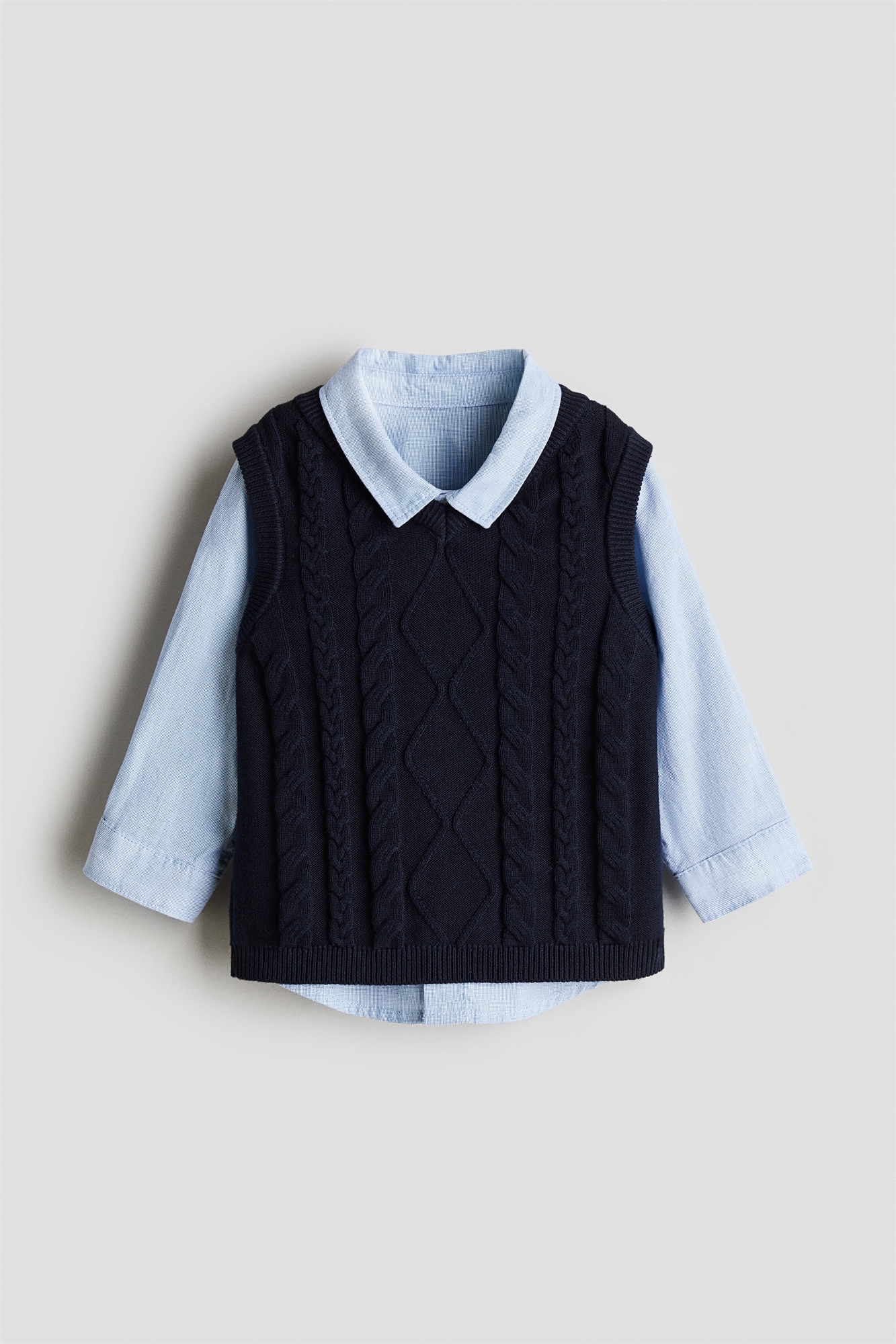 Комплект из рубашки из мягкого хлопкового полотна и жилета из мягкого хлопкового трикотажа. Рубашка с длинными рукавами, отложным воротником, пуговицами спереди, манжетами на пуговицах и закругленным подолом. Свитер-жилет с V-образным вырезом и ребристой отделкой.