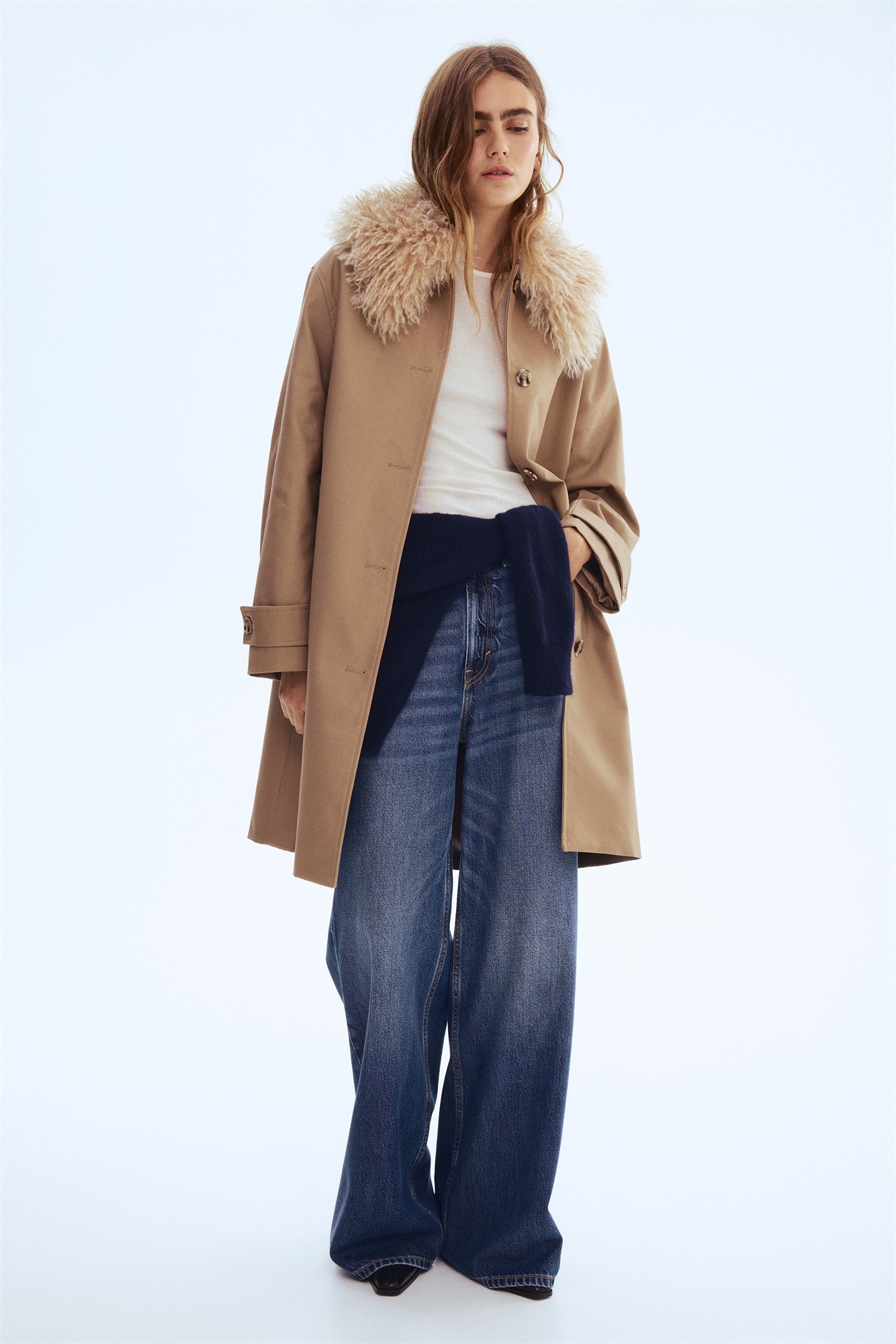 Однобортное пальто длиной до колена из мягкой хлопковой саржи с большим съемным отложным воротником из пушистой ткани. Пуговицы спереди, втачные боковые карманы, манжеты на пуговицах и один вентиляционный канал сзади. На подкладке.