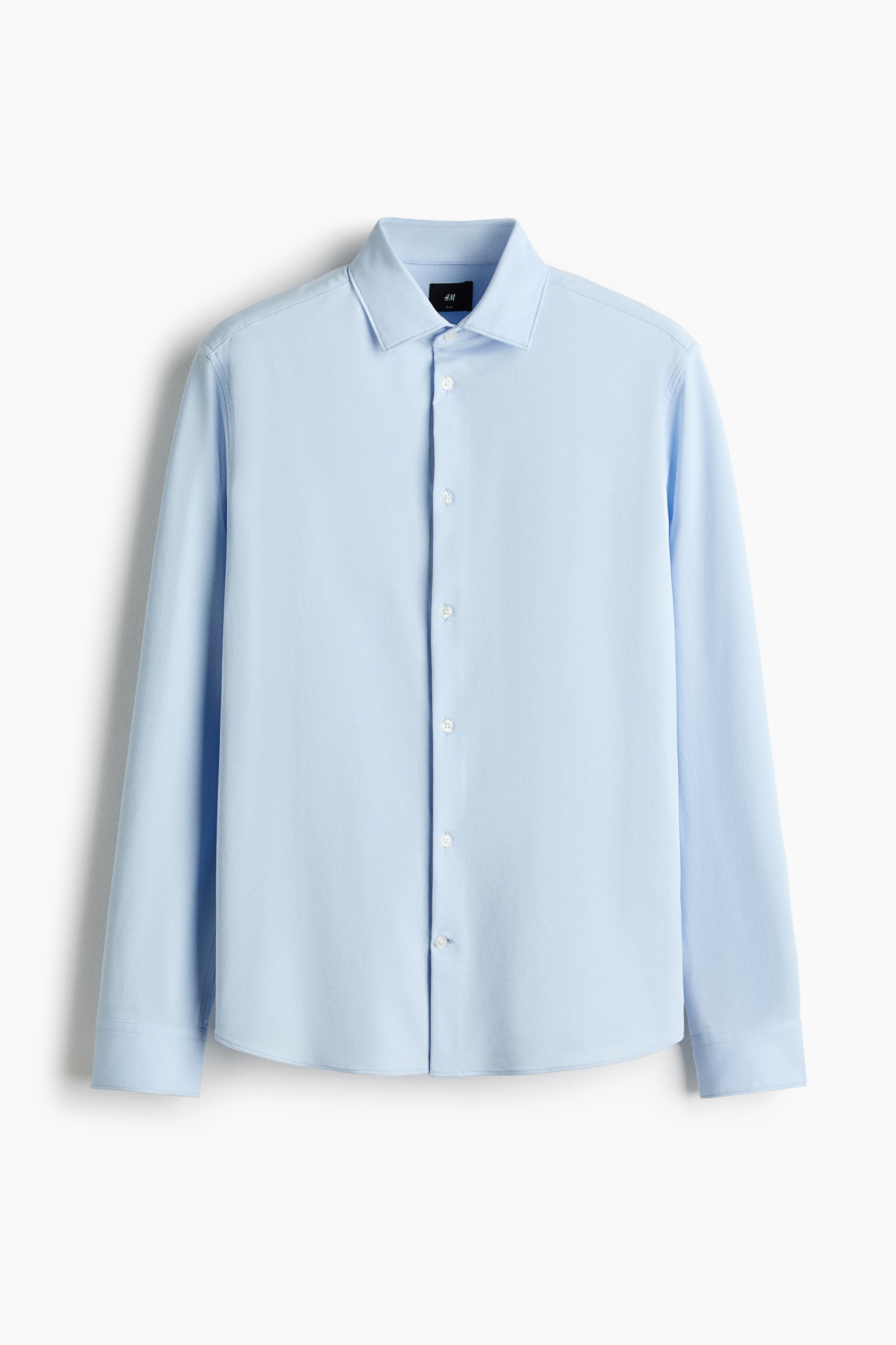 Рубашка из стрейч-джерси из хлопковой смеси с отложным воротником, французским передом и ярмом сзади. Длинные рукава с регулируемыми пуговицами на манжетах и рукавной планкой с пуговицей. Аккуратный закругленный подол. Зауженный крой, облегающий контуры тела и создающий приталенный силуэт.