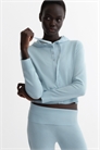 Короткий приталенный кардиган из тонкого трикотажа с капюшоном на завязках и пуговицами спереди. Длинные рукава, манжеты и подол отделаны тесемкой.