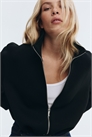 Куртка из ткани скуба с вороненым воротником и застежкой-молнией спереди. Спущенные плечи и складки по подолу. Без подкладки.