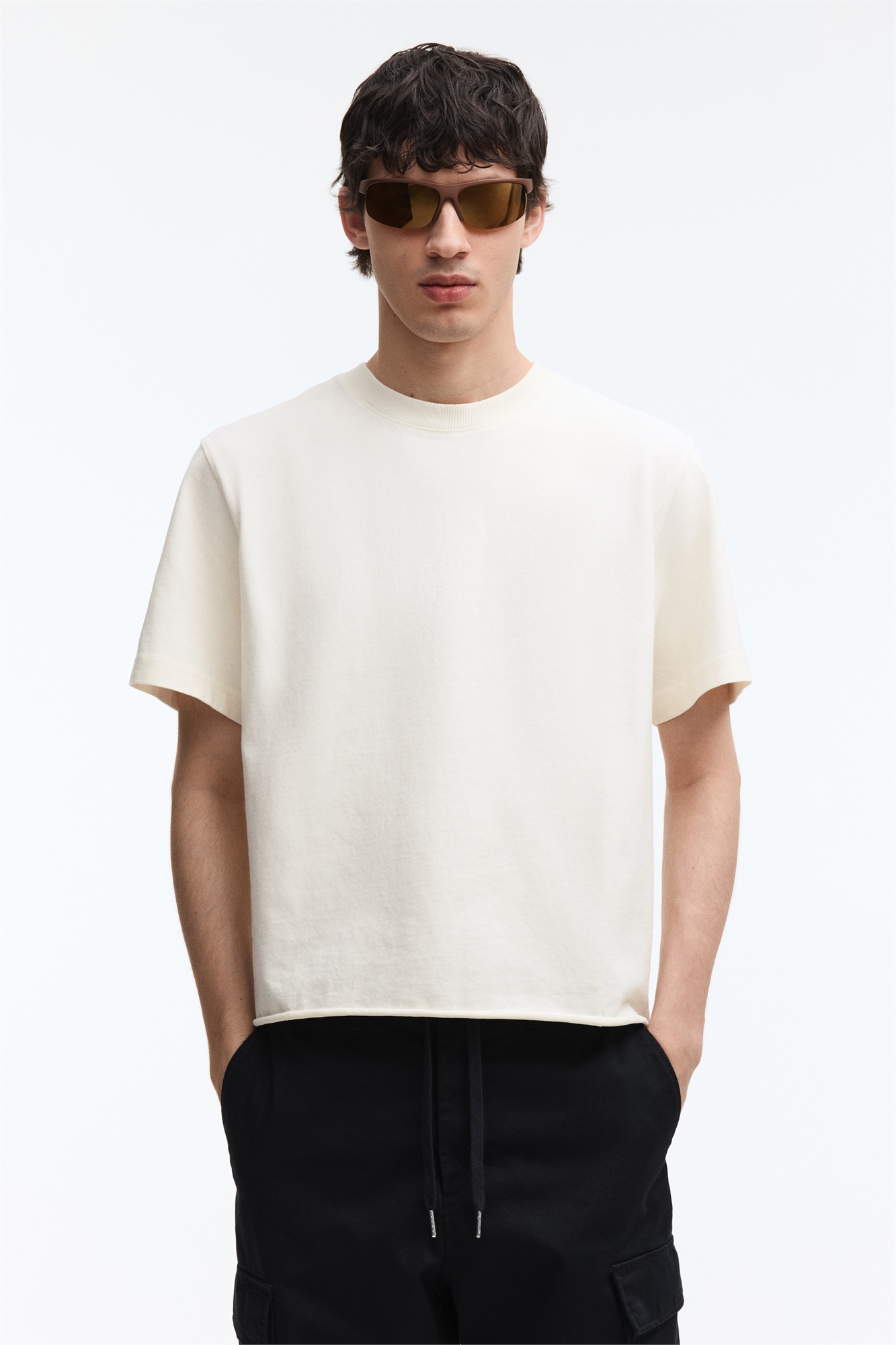 Футболка из плотного хлопкового джерси с эффектом вымытого материала, с круглым вырезом с ребристой отделкой, заниженными плечами и необработанным краем по низу. Классический крой для комфортной носки и классического силуэта.