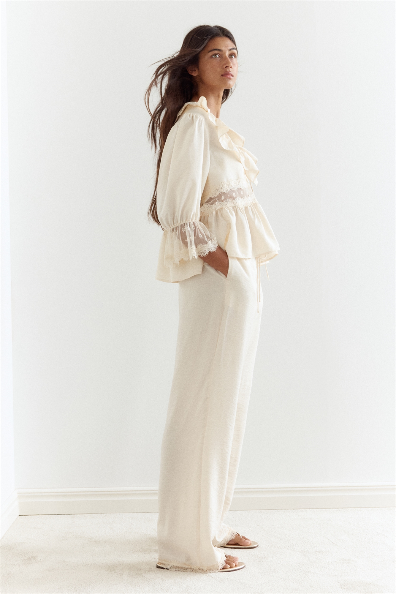 Брюки из вискозного полотна с легким блеском. Эластичный пояс с завязками и прямые ноги с кружевной отделкой.