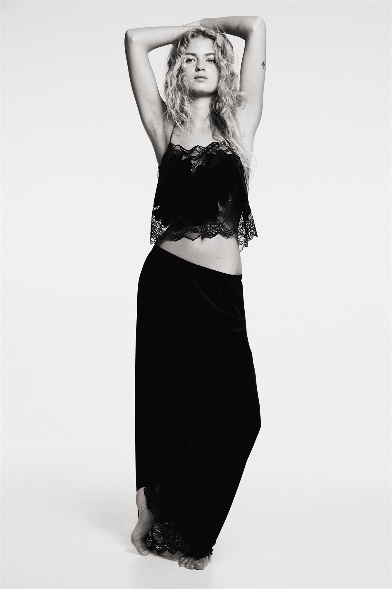 Короткий топ из мягкого велюра с кружевными вставками и бретельками-спагетти.
