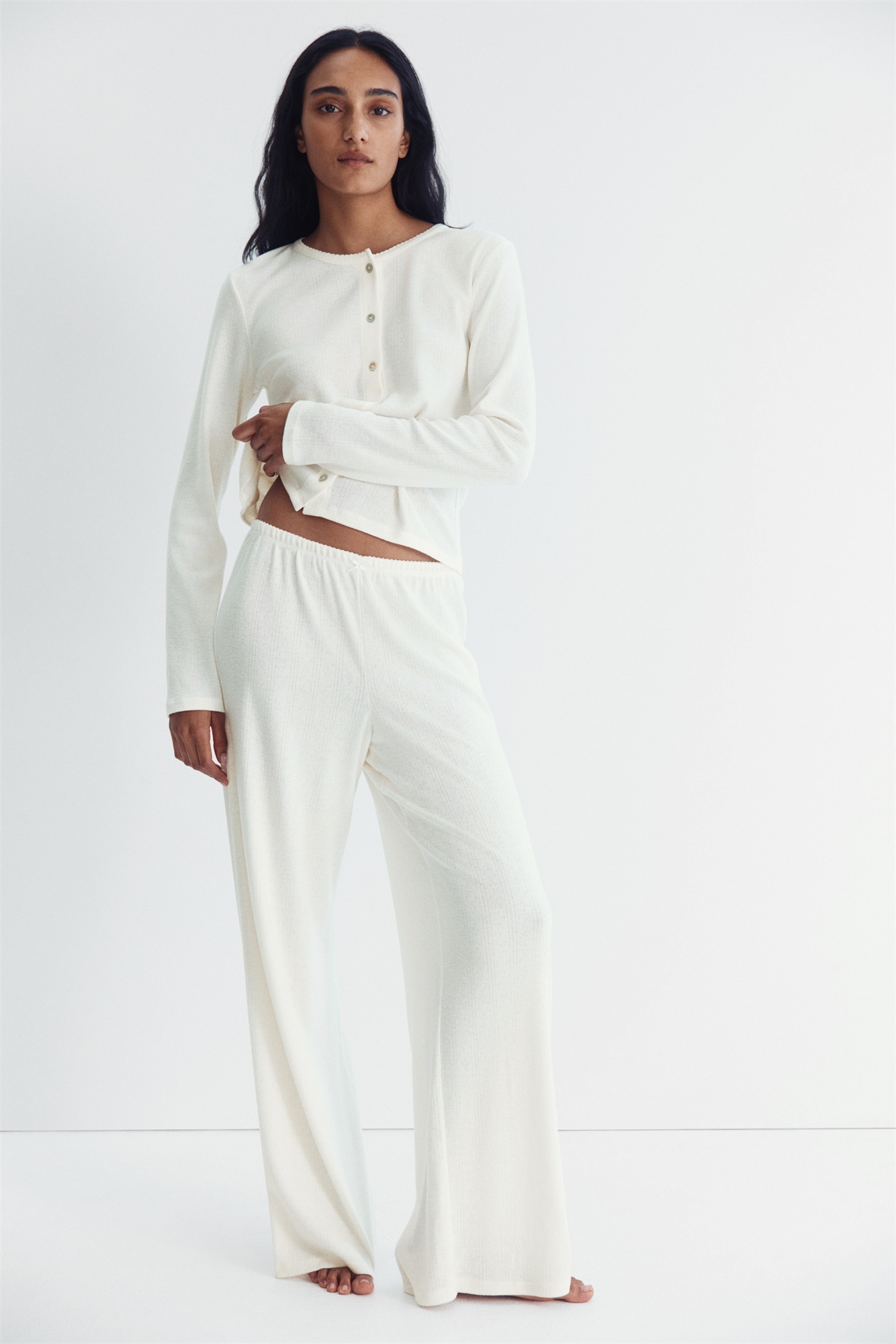 Пижама с кардиганом и нижними штанишками из мягкого трикотажа пуантель. Кардиган с круглым вырезом с гребешком и пуговицами спереди. Низ с эластичной талией.