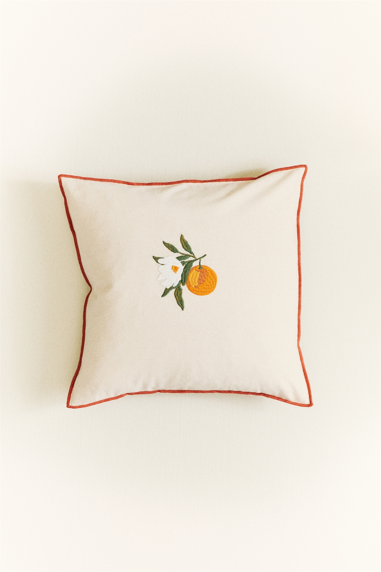 Наволочка из хлопчатобумажной ткани с вышитым мотивом на лицевой стороне и контрастной окантовкой по краям. Скрытая застежка-молния сзади.