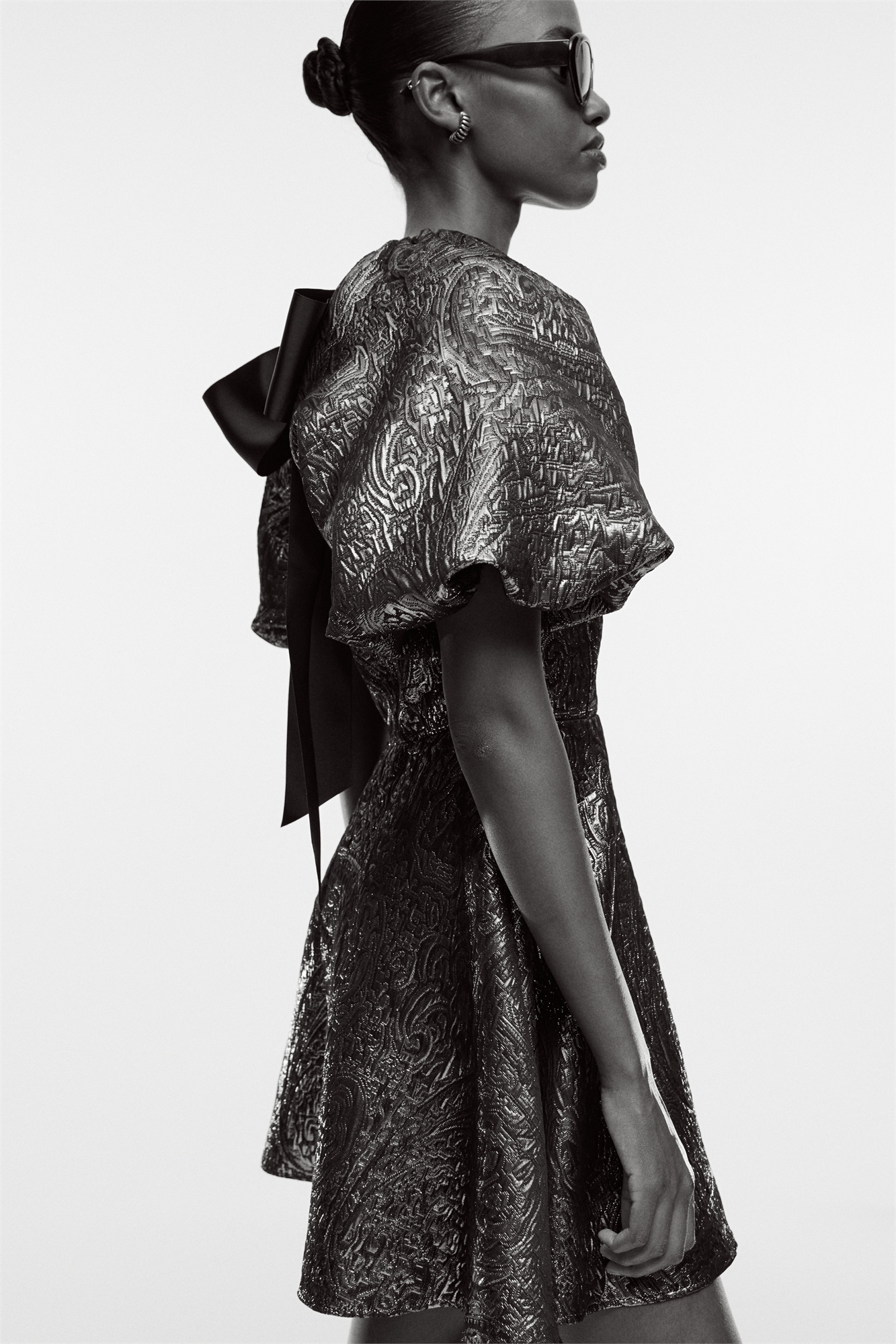 Короткое приталенное платье из тканого материала с круглым вырезом и проймой сзади с широкими лентами из гросгрейн в верхней части. Короткие рукава реглан с наполнителем из органзы и потайная застежка-молния с одной стороны. Слегка расклешенная юбка. Частично на подкладке.