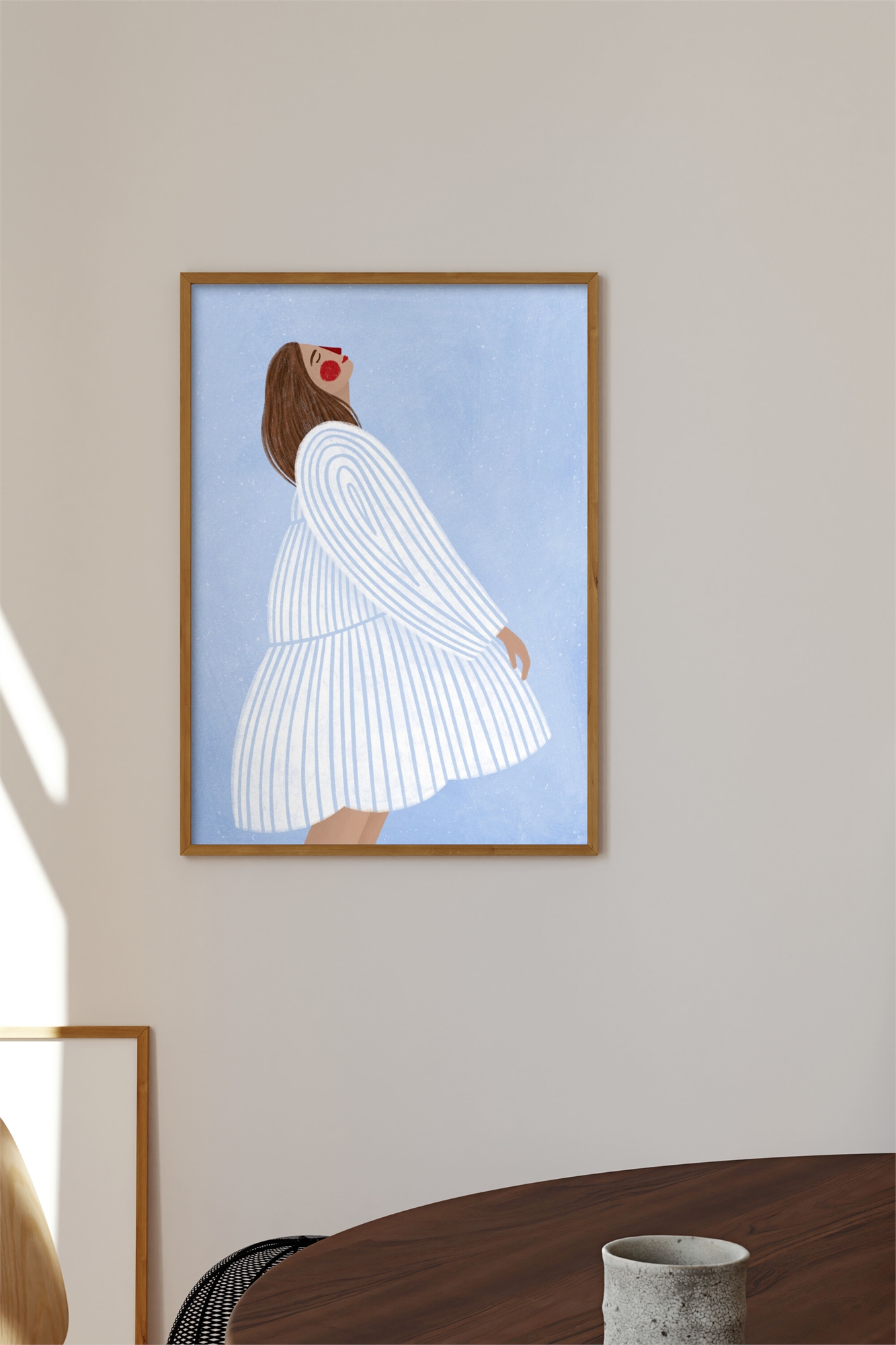 ** Рамка в комплект не входит. ** На этом элегантном постере изображена женщина в струящемся полосатом сине-белом платье на нежно-голубом фоне. В минималистичном, но выразительном стиле картина передает ощущение движения и уверенности. Тонкие текстуры и приглушенные тона делают ее прекрасным дополнением к современным интерьерам, комнатам в модной тематике или коллекциям современного искусства. Идеально подходит для любителей женской эстетики и стильного домашнего декора, этот уникальный принт сочетает в себе изысканность и простоту.