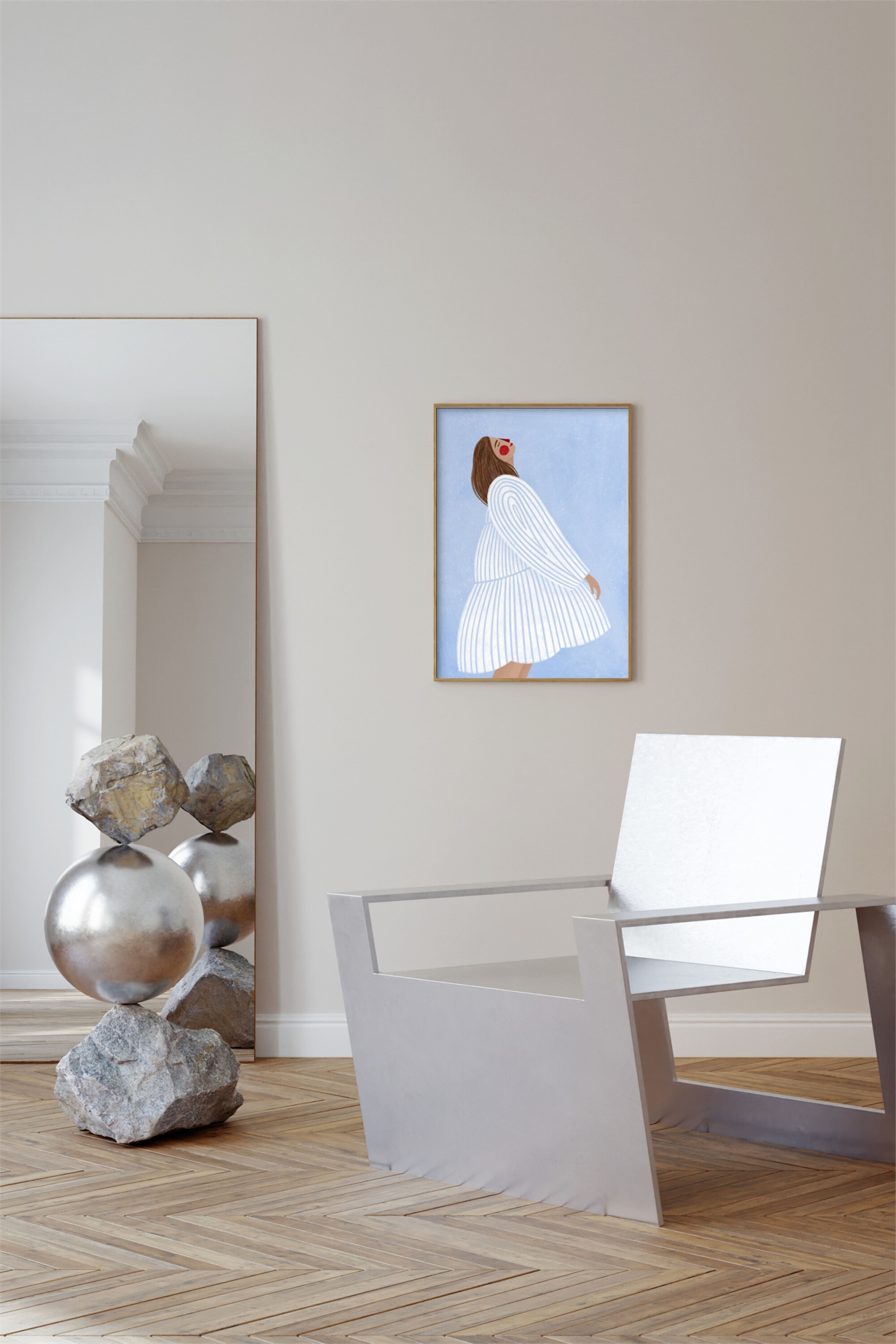 ** Рамка в комплект не входит. ** На этом элегантном постере изображена женщина в струящемся полосатом сине-белом платье на нежно-голубом фоне. В минималистичном, но выразительном стиле картина передает ощущение движения и уверенности. Тонкие текстуры и приглушенные тона делают ее прекрасным дополнением к современным интерьерам, комнатам в модной тематике или коллекциям современного искусства. Идеально подходит для любителей женской эстетики и стильного домашнего декора, этот уникальный принт сочетает в себе изысканность и простоту.