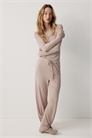 Пижама с верхом и низом из гладкого ребристого трикотажа. Верхняя часть с круглым вырезом, длинными рукавами и необработанными краями на манжетах и подоле. Низ с эластичным поясом на завязках и необработанными краями.