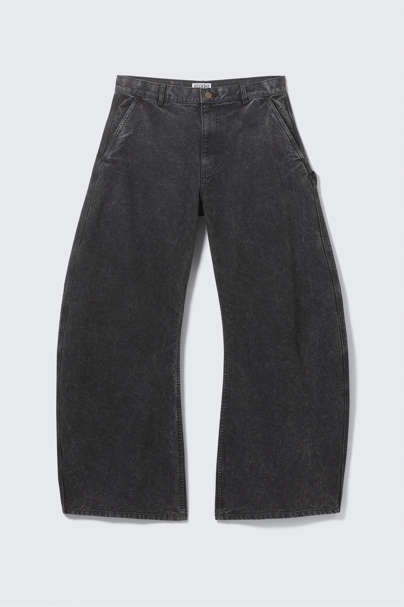 Брюки в стиле рабочей одежды со свободным кроем и бочкообразными штанинами сшиты из хлопка. Модель имеет косые боковые карманы, задние накладные карманы и ширинку на молнии. В качестве отделки использована деталь в виде петли с молотком, что придает им утилитарный вид.