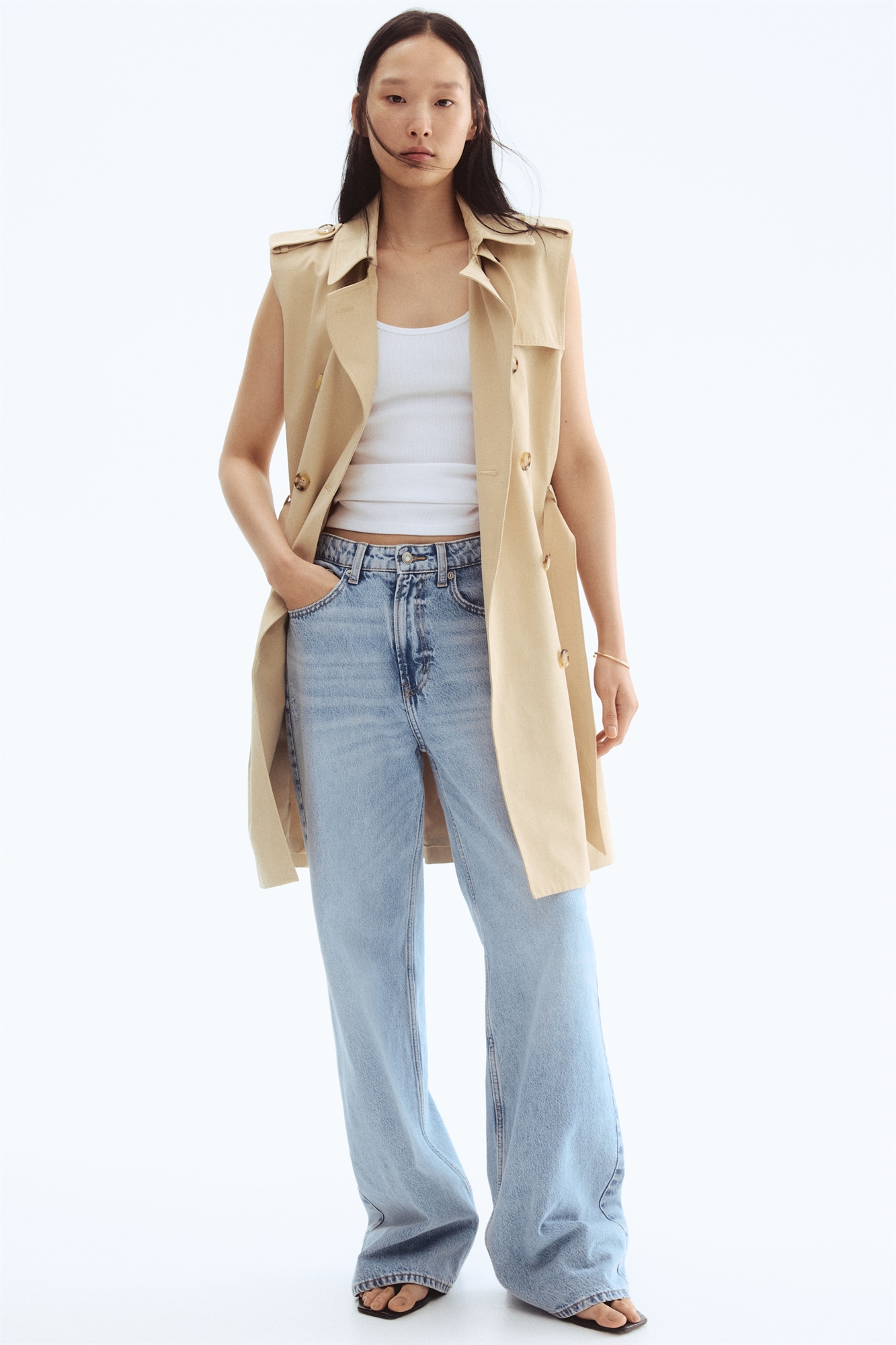Плащ без рукавов длиной до колена из хлопковой саржи с двумя рядами пуговиц и поясом на талии. Бретели на пуговицах и боковые втачные карманы. На подкладке.