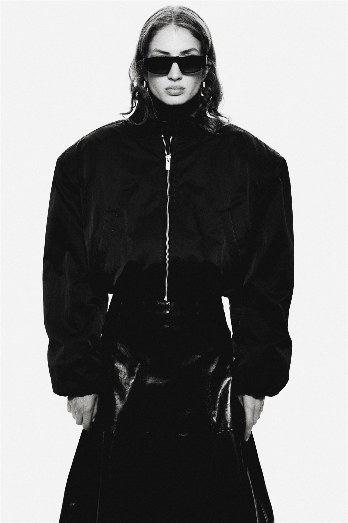 Короткая куртка больших размеров из тканого материала с ребристым воротником, застежкой на молнию спереди и накладными карманами с потайной кнопкой. Иг сзади, подплечники, направленные вперед плечевые швы и длинные рукава. Узкие эластичные манжеты и подол. На подкладке.