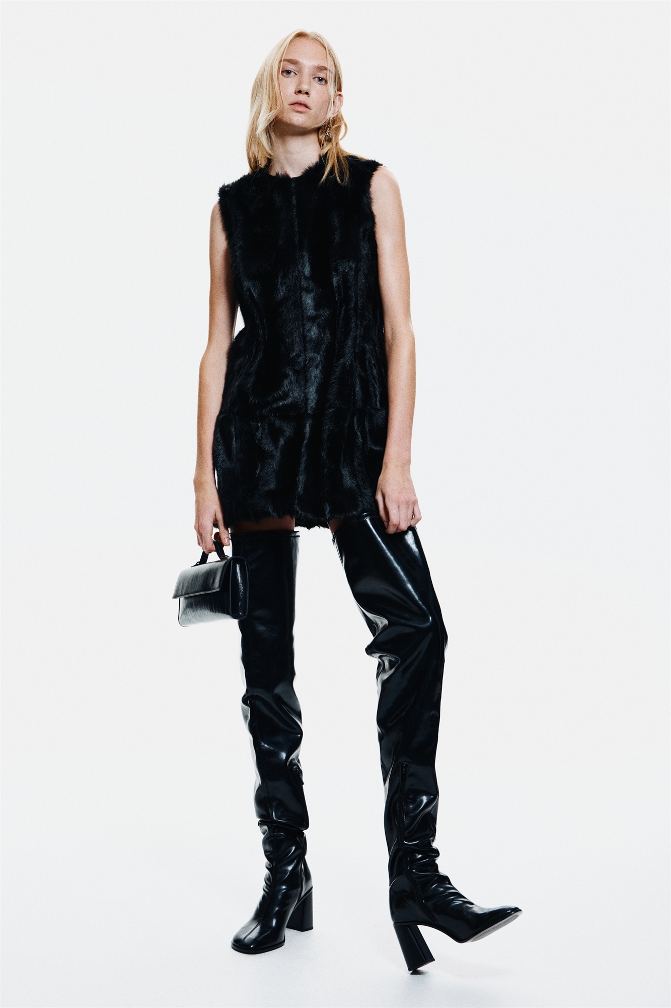 Короткое платье без рукавов из мягкой пушистой ткани. Круглый вырез и застежка-молния на спине с притачной планкой. Складки на талии и видимые швы по бокам и подолу. На подкладке.