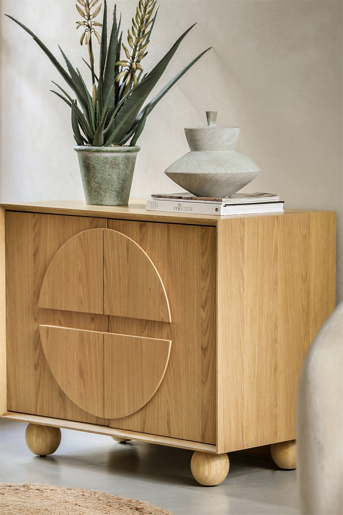 Этот двухдверный шкаф с геометрическим узором и округлыми ножками сочетает в себе намек на ретро-дизайн и современную практичность. Шкаф из дуба и дубового шпона добавит нотку модной прохлады в ваш дом, где бы вы его ни использовали. Размеры: W850mmxD450mmxH700mm