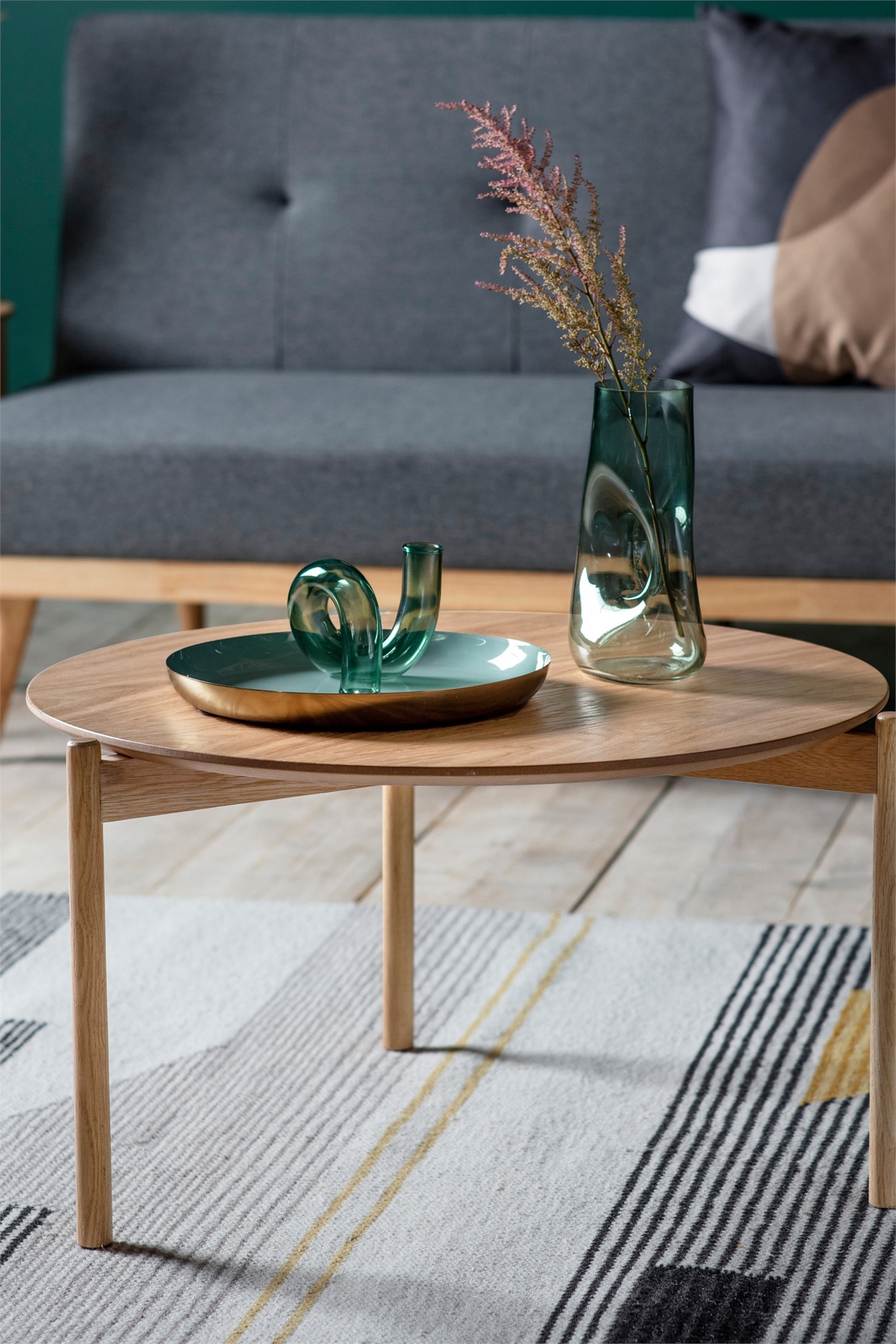 Стильный журнальный столик с простым, но потрясающим дизайном. Круглая столешница изготовлена из шпона ореха и установлена на основание из массива дуба, окрашенное в тон столешницы, а концы изящных круглых ножек повторяют форму столешницы.Размеры: W700mmxD700mmxH400mm