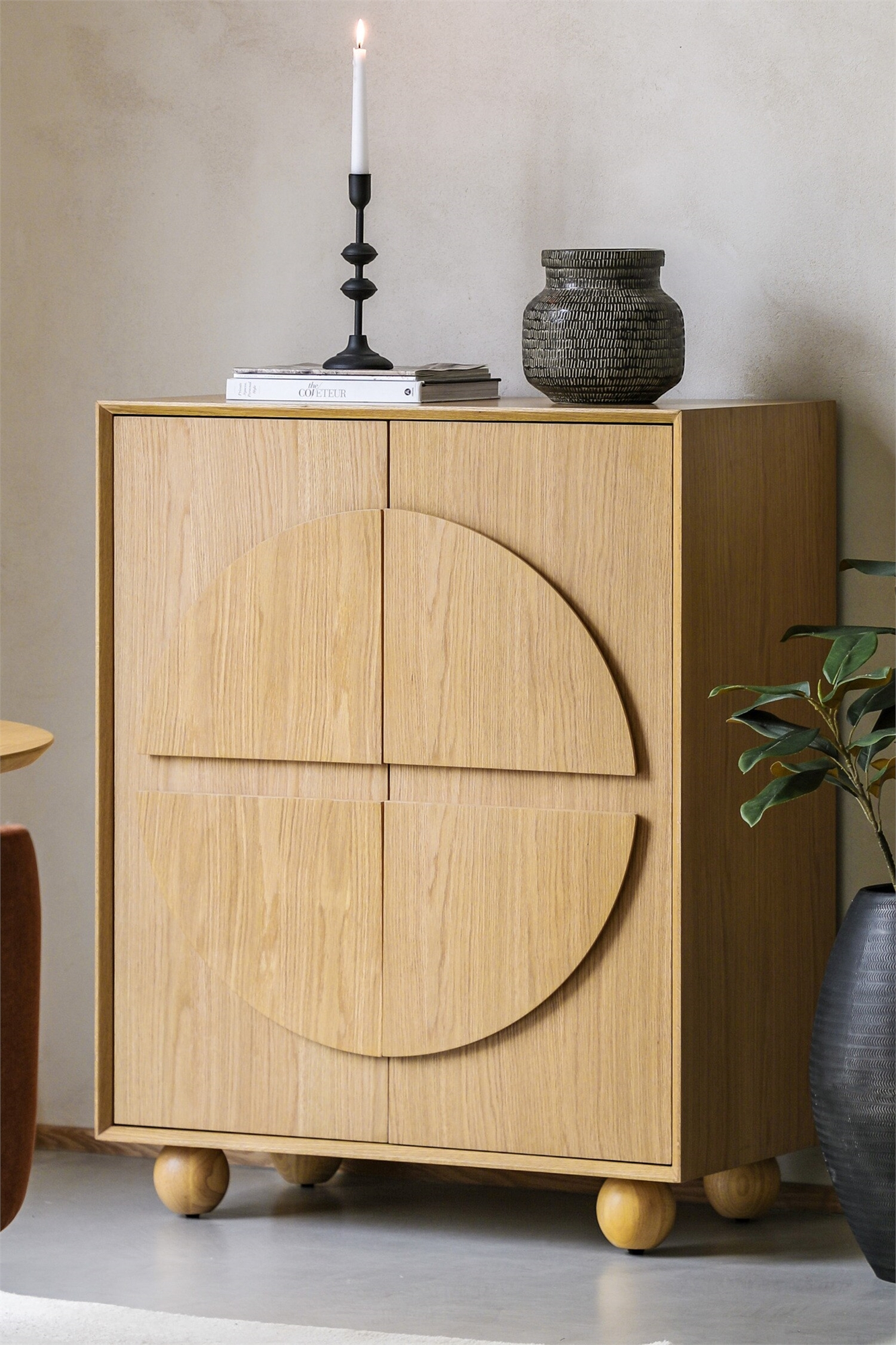 Этот потрясающий сервант, сочетающий в себе стиль и практичность, создан для того, чтобы подчеркнуть использование геометрических узоров, в духе ретро, но в более современном формате. Дверцы имеют красивую круглую форму, а ножки сферической формы повторяют ее. Для его изготовления используется шпон и массив дуба, где это возможно, с натуральной матовой отделкой. Размеры: W850mmxD450mmxH1100mm