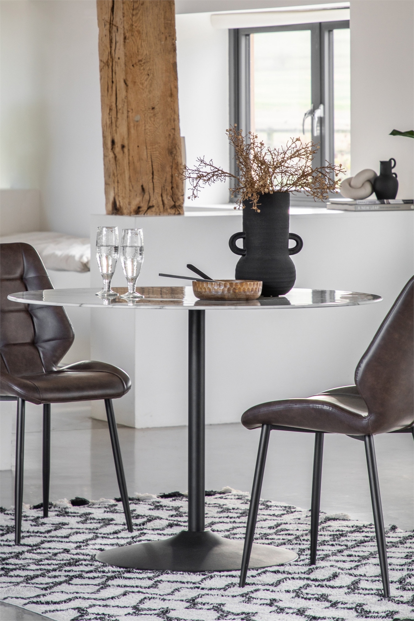 Этот стол с изысканной круглой столешницей из искусственного белого мраморного стекла и плавно изогнутым темным хромированным основанием выглядит потрясающе современно. Он рассчитан на 4 персоны и отлично подходит для небольших помещений, где стиль по-прежнему важен. Размеры: W1100mmxD1100mmxH750mm