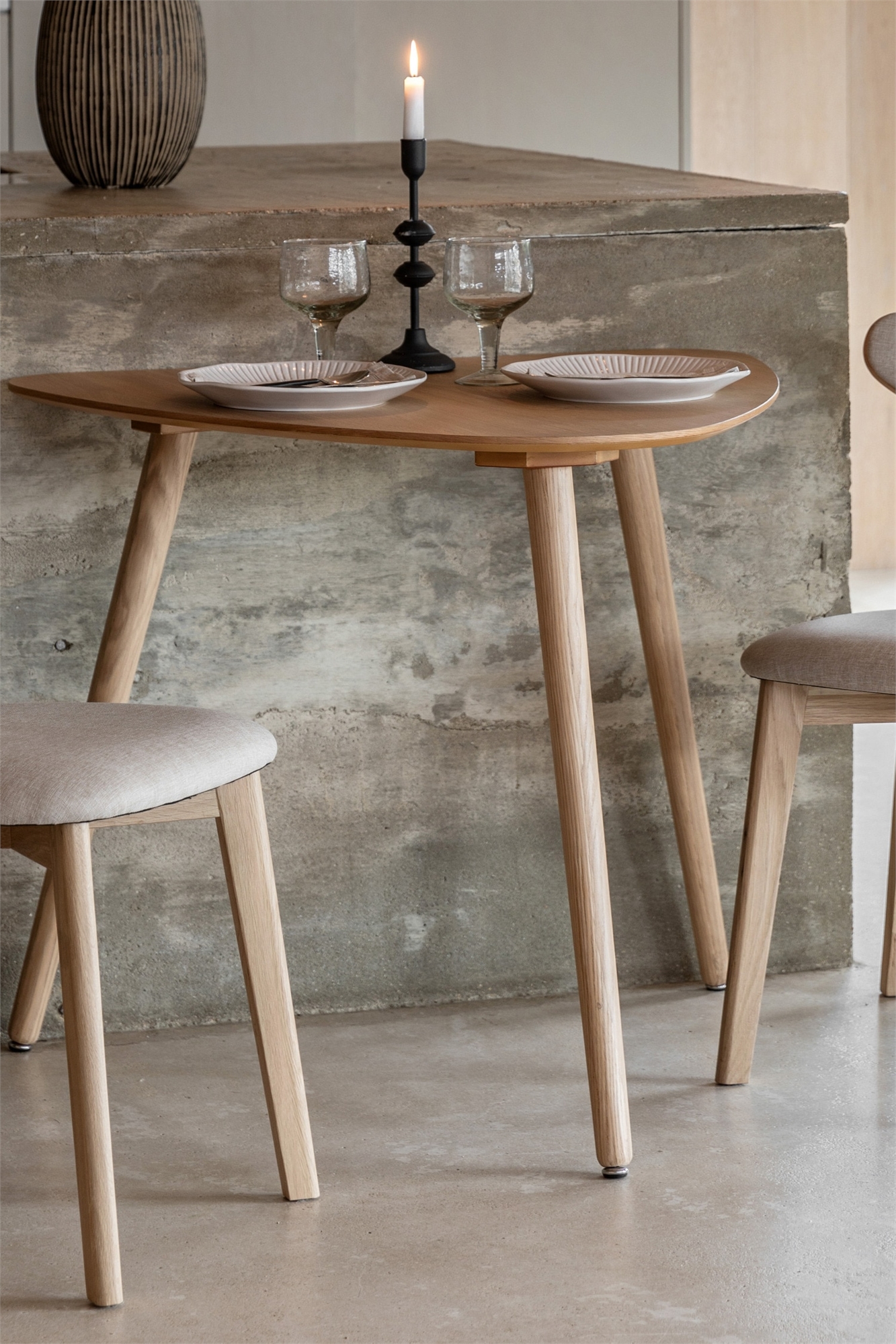 Этот прекрасный обеденный стол идеально подходит для небольших помещений. В нем чувствуется ретро и современные нотки. Красивая фигурная столешница прекрасно дополняется элегантными ножками. Он изготовлен из шпона дуба и каучукового дерева с натуральной отделкой. Размеры: W800mmxD900mmxH750mm