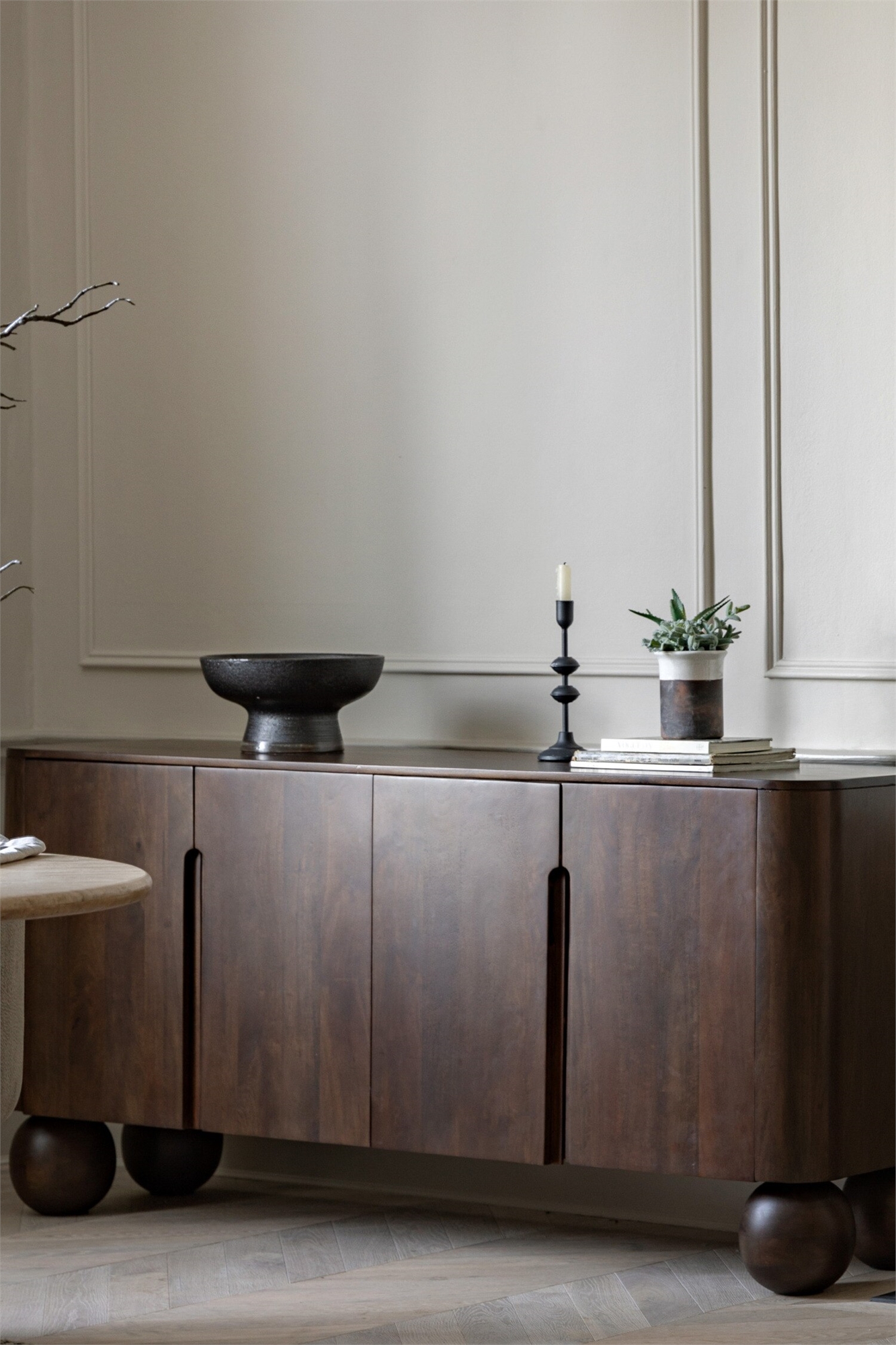Этот привлекательный сервант изготовлен из массива дерева манго с богатой глубокой отделкой. Передние углы серванта плавно изогнуты, а элегантные тонкие ручки на дверцах изогнуты вверху, повторяя этот изгиб. Шарообразные ножки завершают образ этого эффектного ретро-объекта.Размеры: W1700mmxD430mmxH800mm