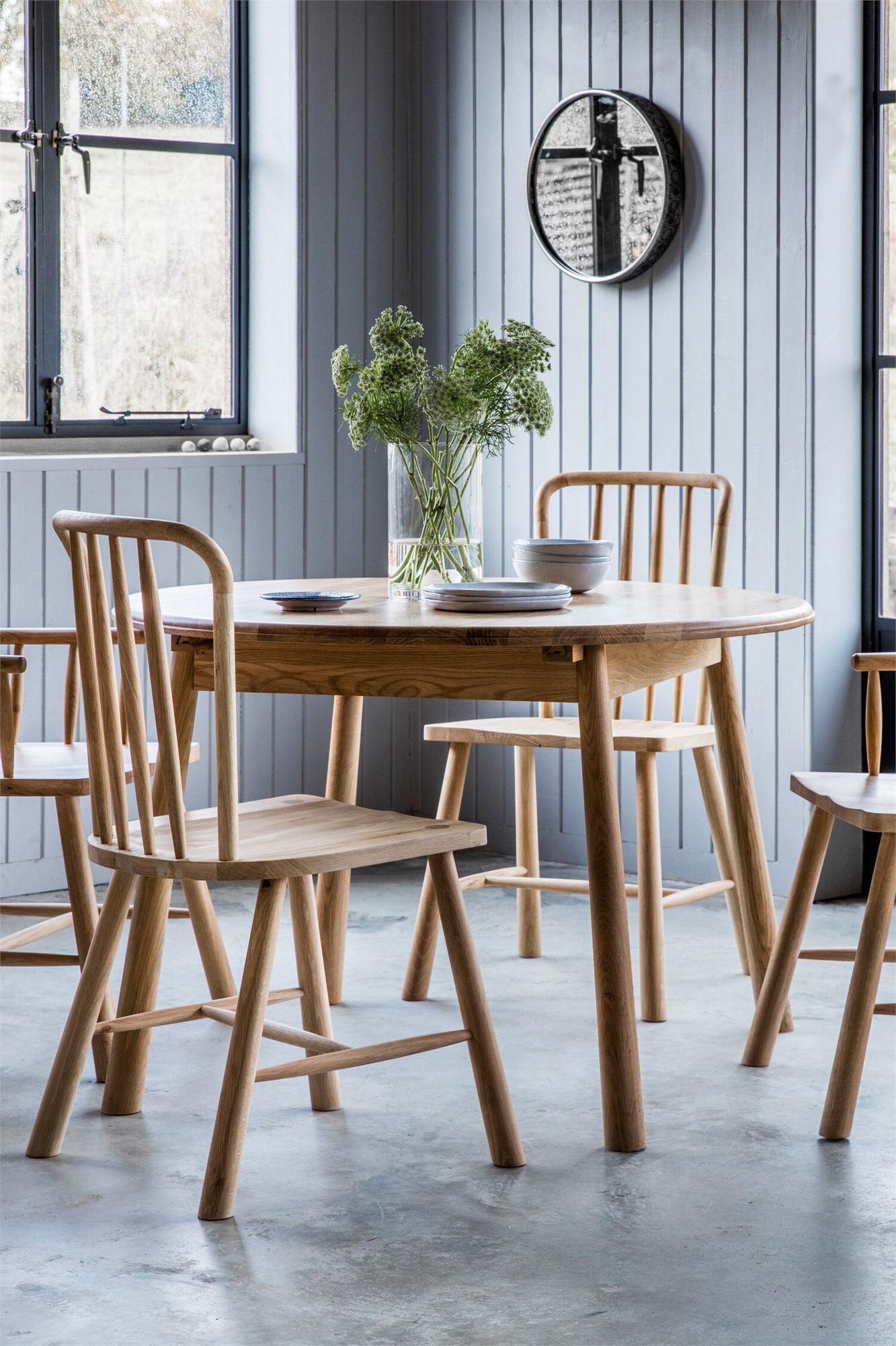 Изготовлен из лучшего массива дуба и шпона в мокрой отделке, что обеспечивает практичность и функциональность. Этот круглый раздвижной обеденный стол оснащен простым в использовании механизмом "бабочка" и коническими ножками. Этот стол ловко раскладывается от 110 до 155 см, за которым с комфортом разместятся 6 человек. Размеры: W1100mmxD1100mmxH750mm