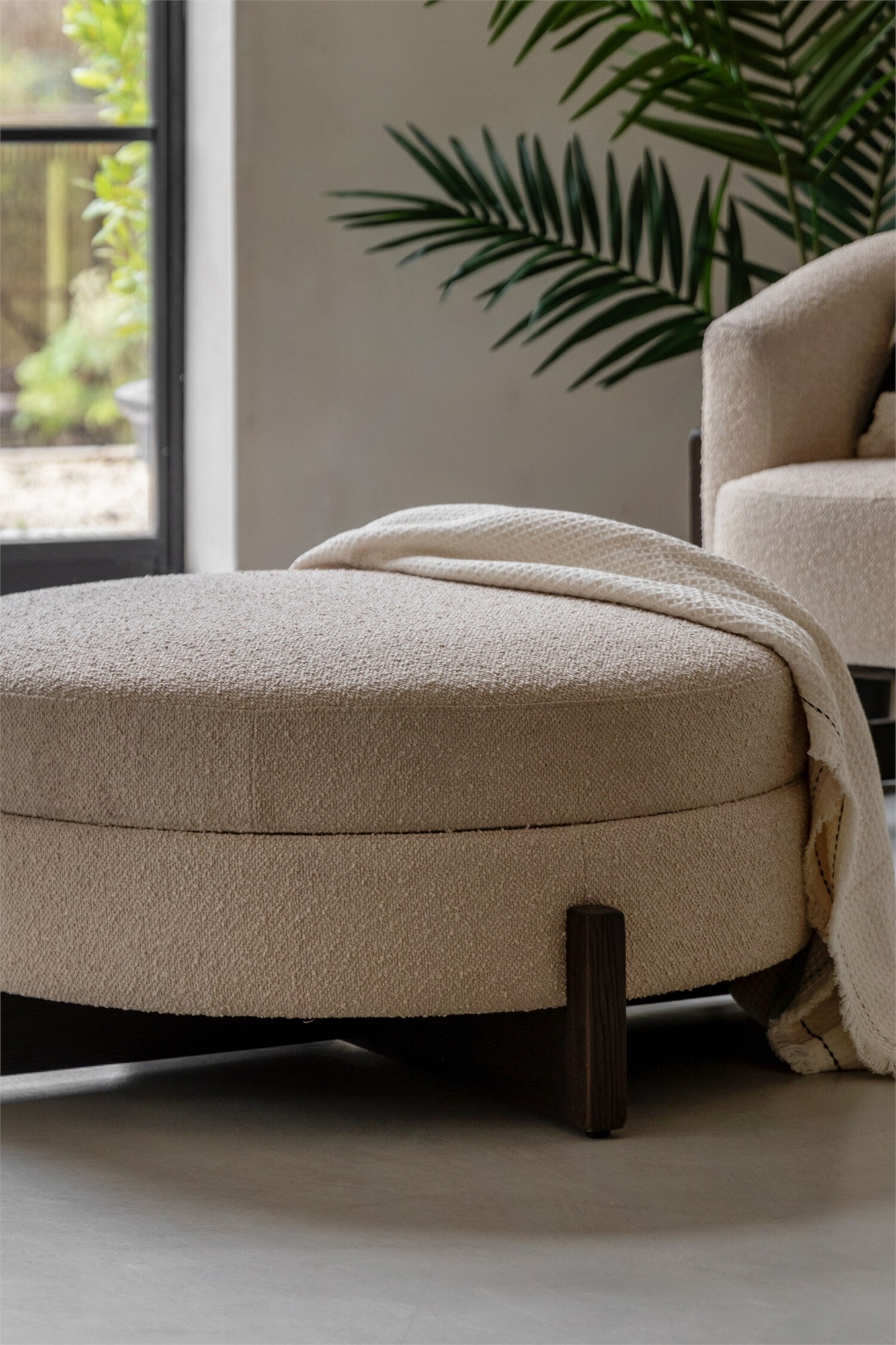 Этот пуфик сочетает в себе стиль и функциональность в компактном дизайне. Обитый мягкой текстурированной тканью, он имеет изящный силуэт, который дополнит самые разные интерьеры. Скрытый отсек для хранения добавляет практичности, обеспечивая удобное место для организации пространства в гостиной. Размеры: W920mmxD920mmxH445mm