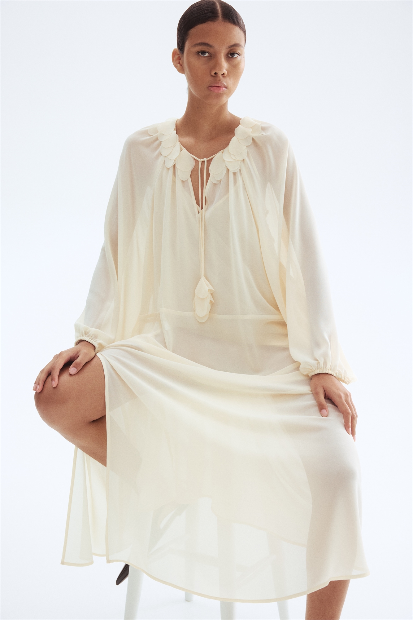 Платье длиной до щиколоток из шифона с круглым вырезом с аппликациями, V-образной проймой и узкими завязками с аппликациями спереди. Длинные рукава реглан с эластичными манжетами и подол прямого кроя с разрезом спереди. Короткое нижнее платье с V-образным вырезом и регулируемыми бретелями.