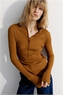 Облегающий топ из трикотажа в рубчик с круглым вырезом, застежкой на пуговицы спереди и длинными рукавами.