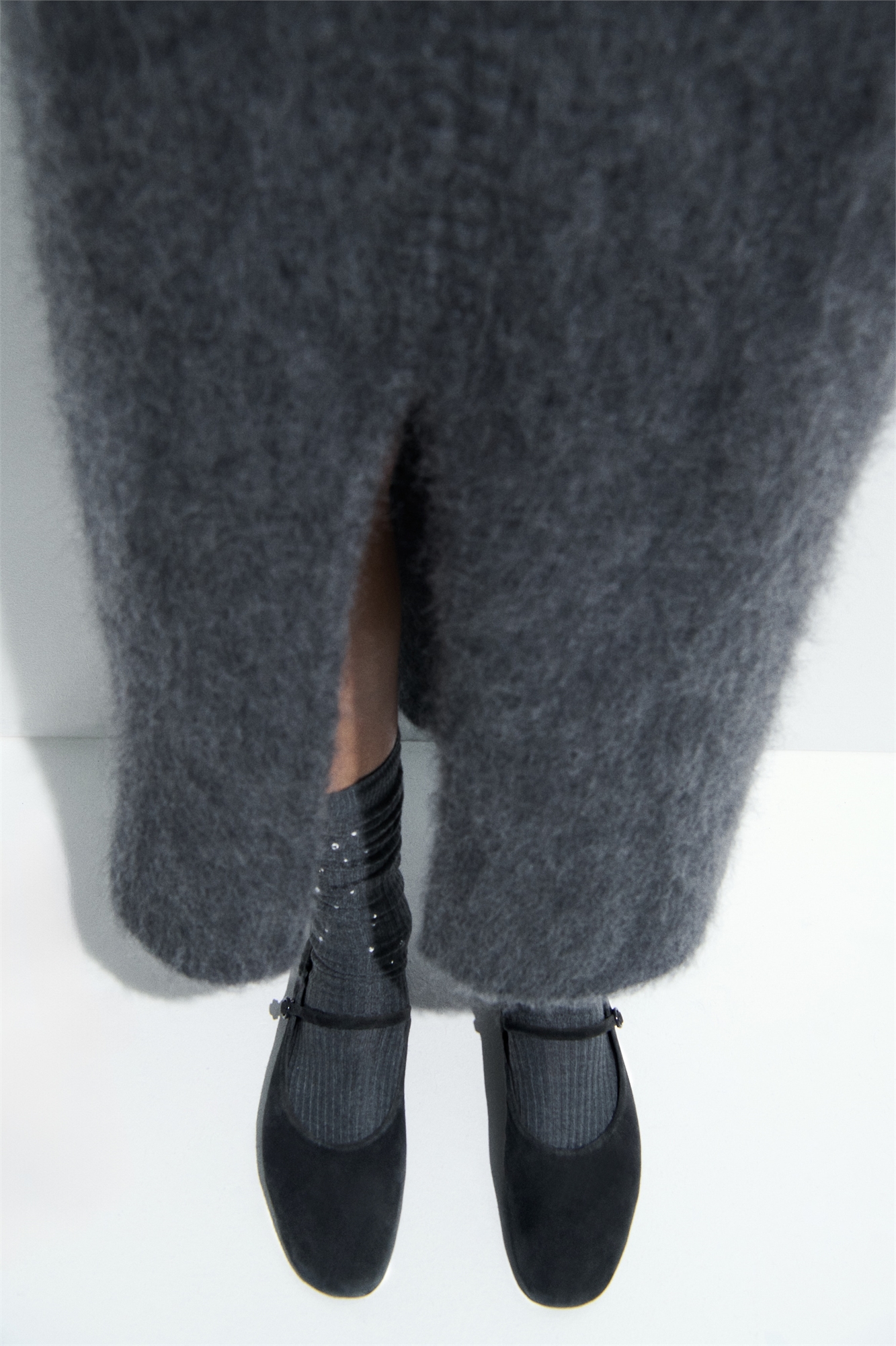 Балетки в стиле Мэри Джейн из мягкой замши с закругленными носками и регулируемым ремешком на ноге с металлической пряжкой. Подкладка из саржи и кожаная стелька.
