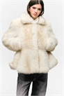 Куртка из мягкого искусственного меха, выполненная в обычном стиле. Она имеет закругленный воротник, подол в виде пеплума для придания силуэту четкости и незаметные карманы в швах. Застежка спереди на потайные крючки и глазки, а также подкладка для комфорта.