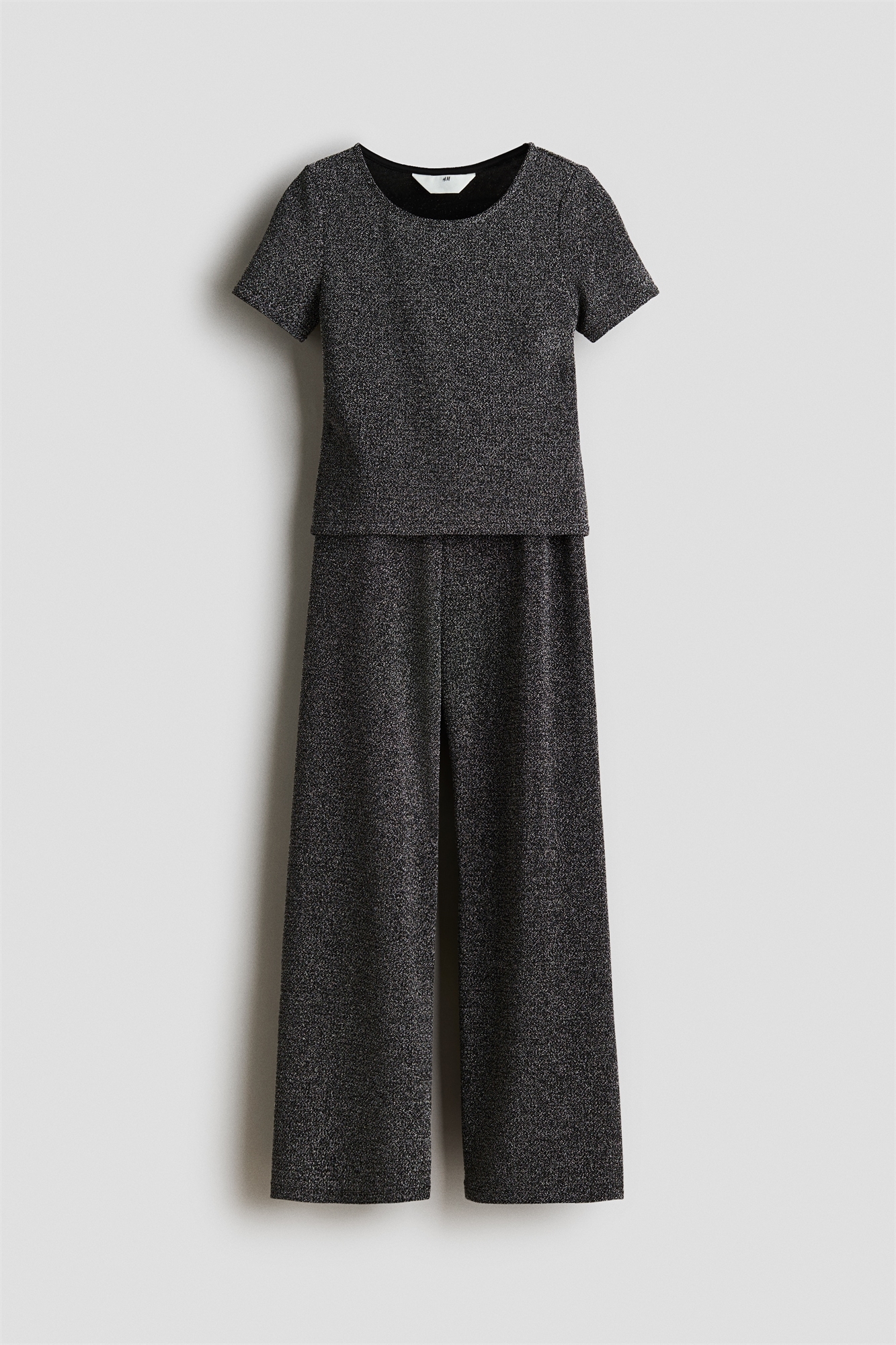 Комплект из топа и брюк из прочного блестящего трикотажа. Топ с короткими рукавами и круглым вырезом. Брюки с эластичным поясом и прямыми ногами.
