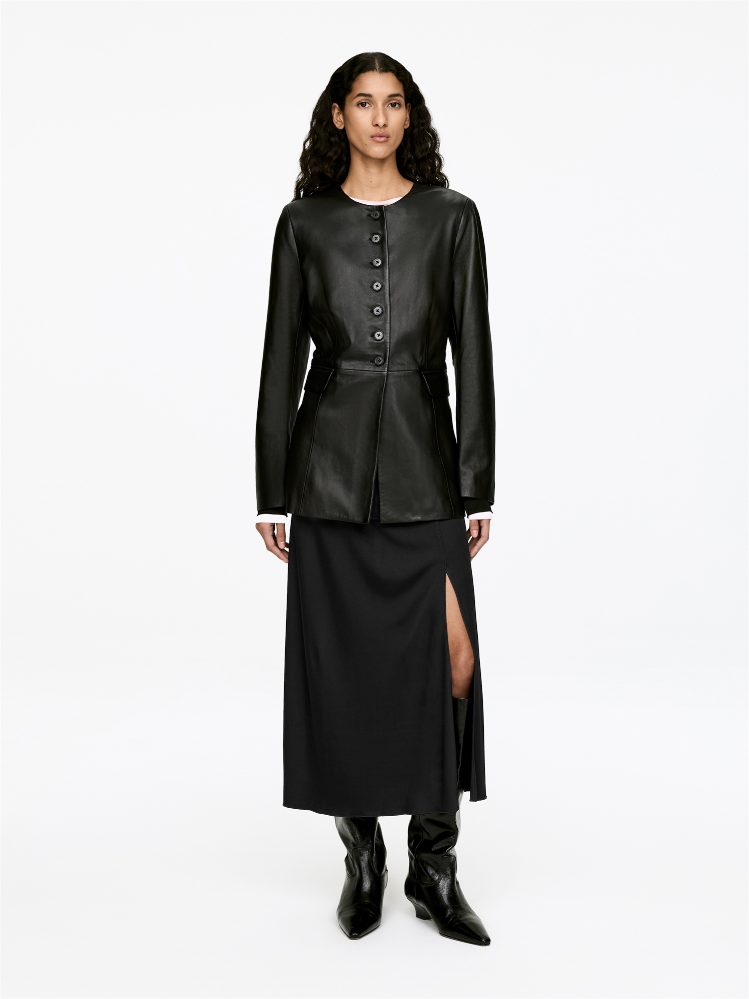 Юбка из блестящей, струящейся ткани джерси из вискозы. Миди прямого покроя с узким эластичным поясом и разрезом до колена.