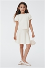Расклешенная юбка из мягкого плотного трикотажа с закрытой резинкой на талии и декоративными жемчужными пластиковыми бусинами по подолу.