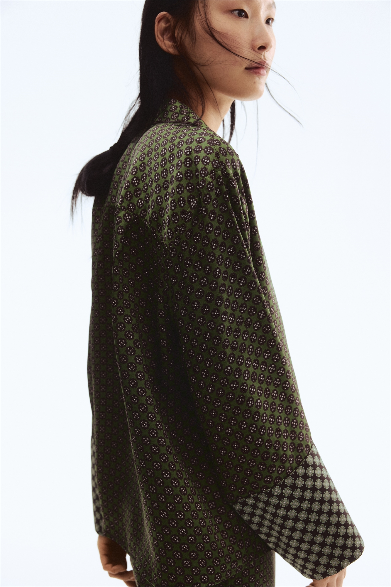 Рубашка из саржи с курортным воротником и пуговицами спереди. Двухслойный воротник сзади и длинные рукава с широкими манжетами. Изогнутый подол.