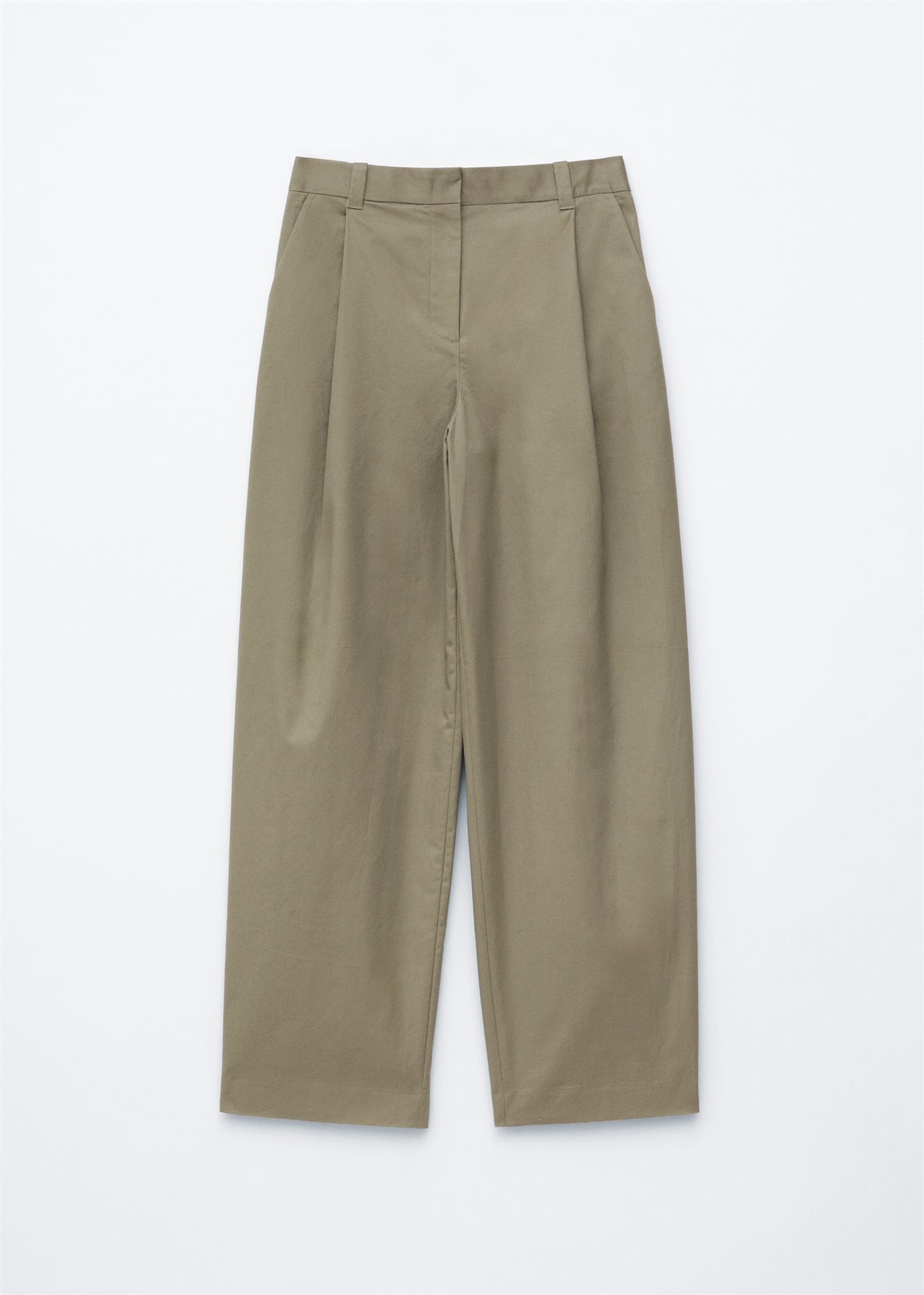 Эти брюки с высокой талией из легкого хлопка имеют прямые брючины с четкими отутюженными складками. Они имеют боковые карманы, задние карманы с отворотом и застежку-молнию спереди с крючком и защелкой. Сочетайте их с лаконичными футболками или блузками классического кроя для создания элегантного образа.